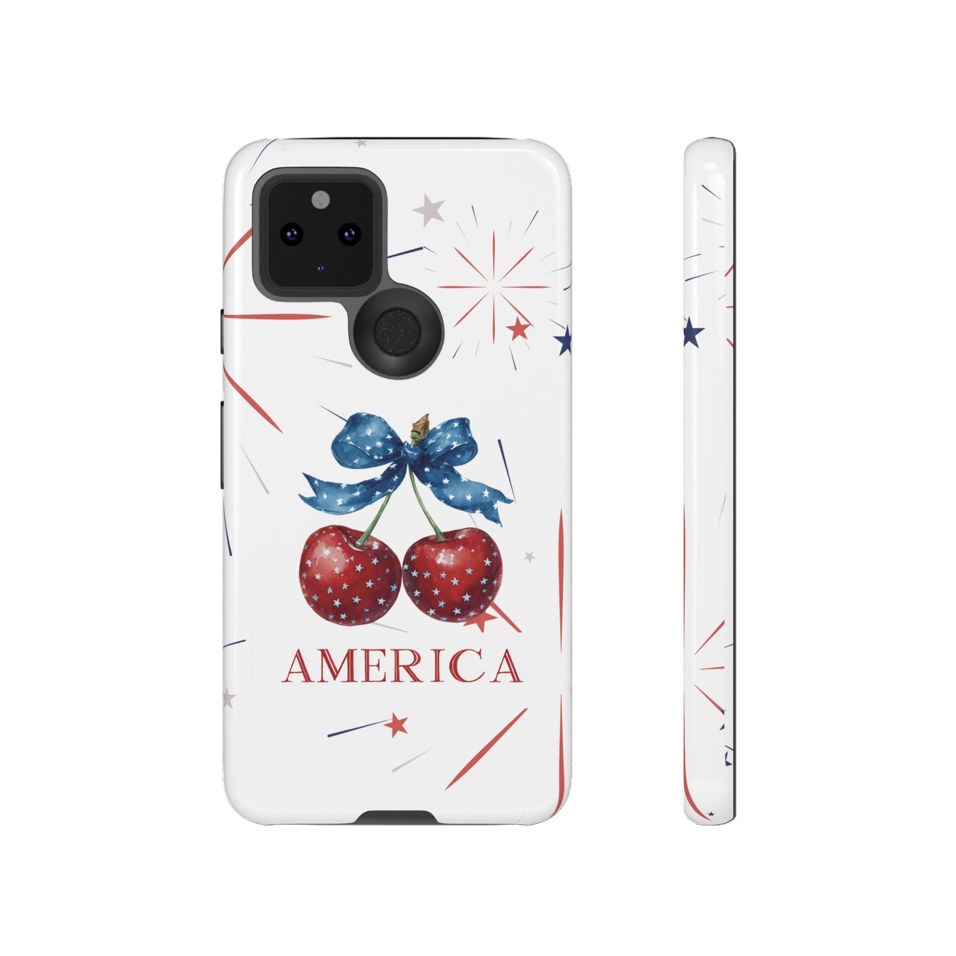 Celebrate with charm and style with the "America's Sweetheart" phone case! This vibrant design features a pair of plump red cherries, each adorned with playful white stars and topped with a festive blue bow. Against a crisp white background, lively red and blue fireworks burst, completing this spirited American theme. The "America's Sweetheart" phone case is ideal for those who love spirited designs and want to show their national pride with a touch of charming flair. It's a festive and fashionable way to accessorize your device.