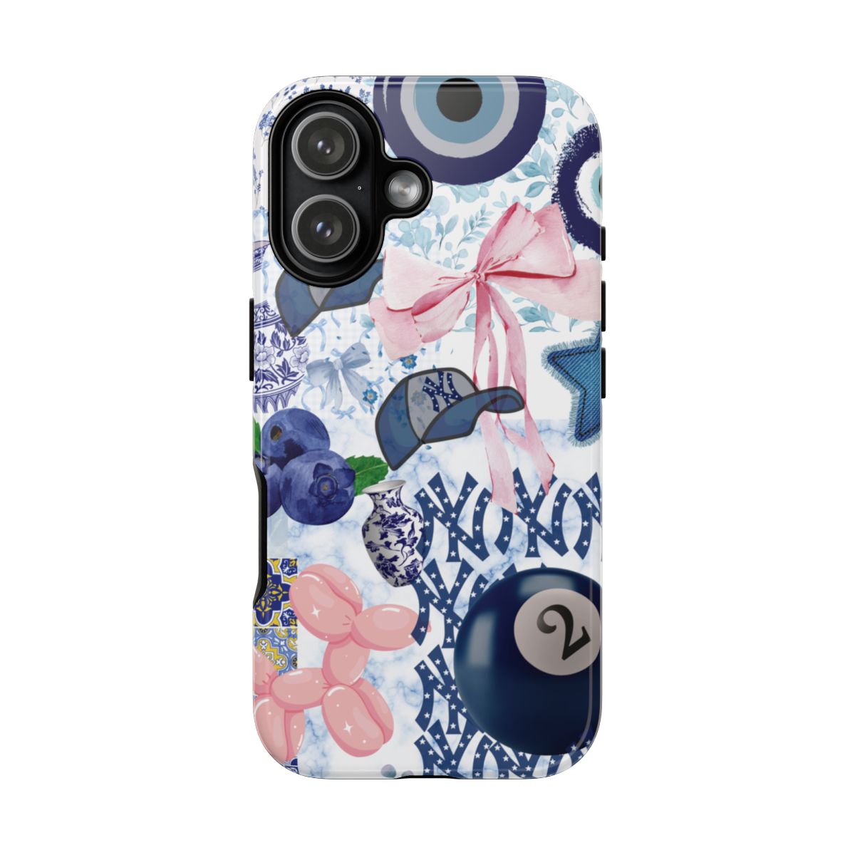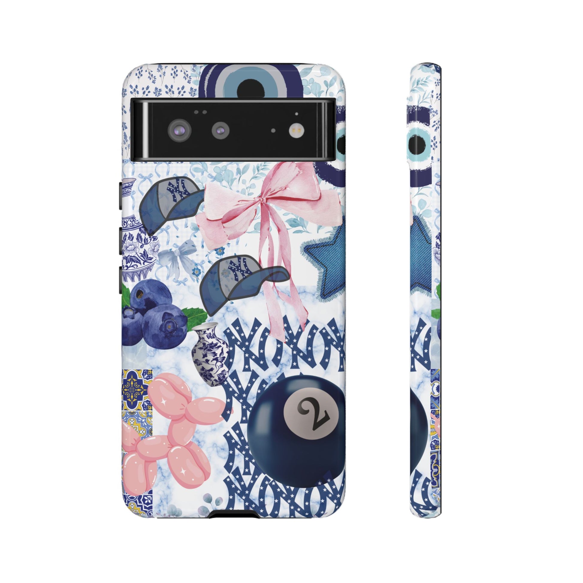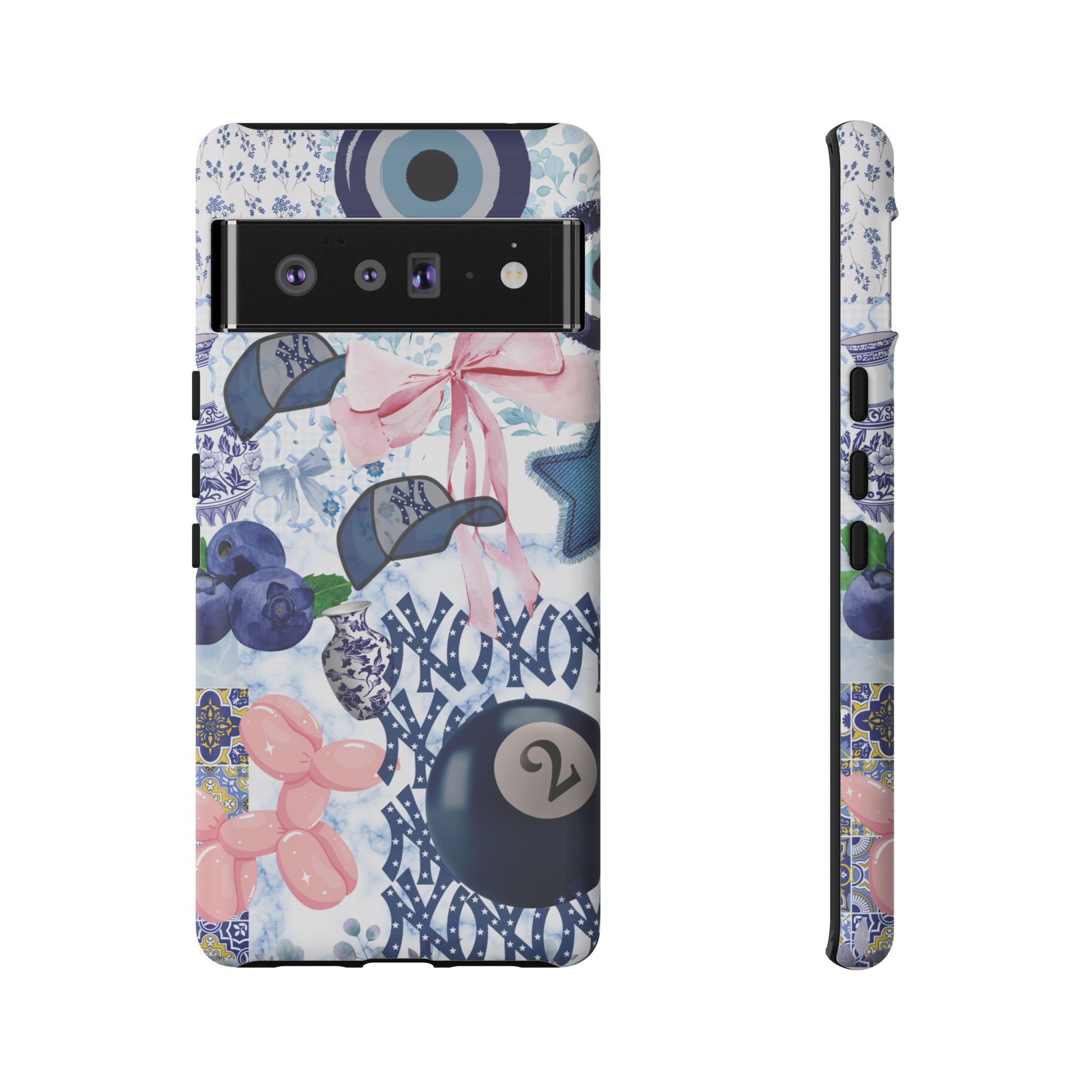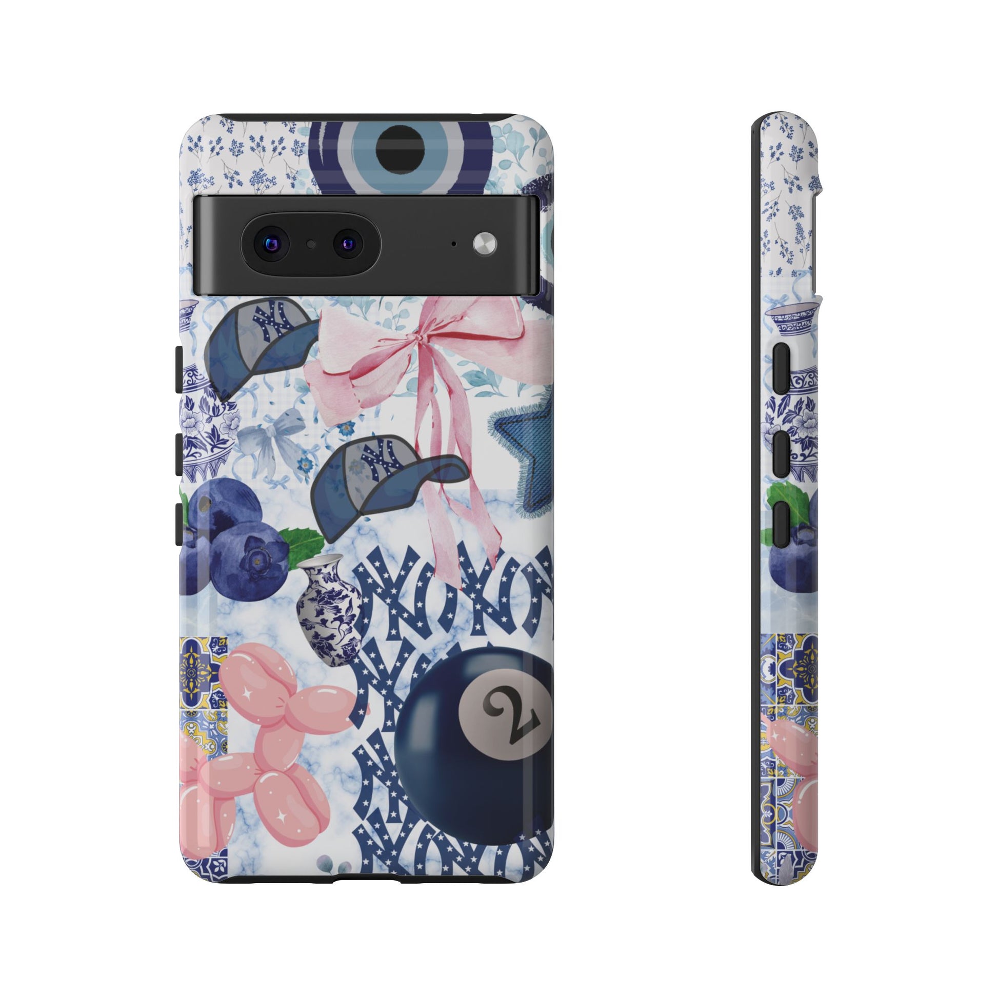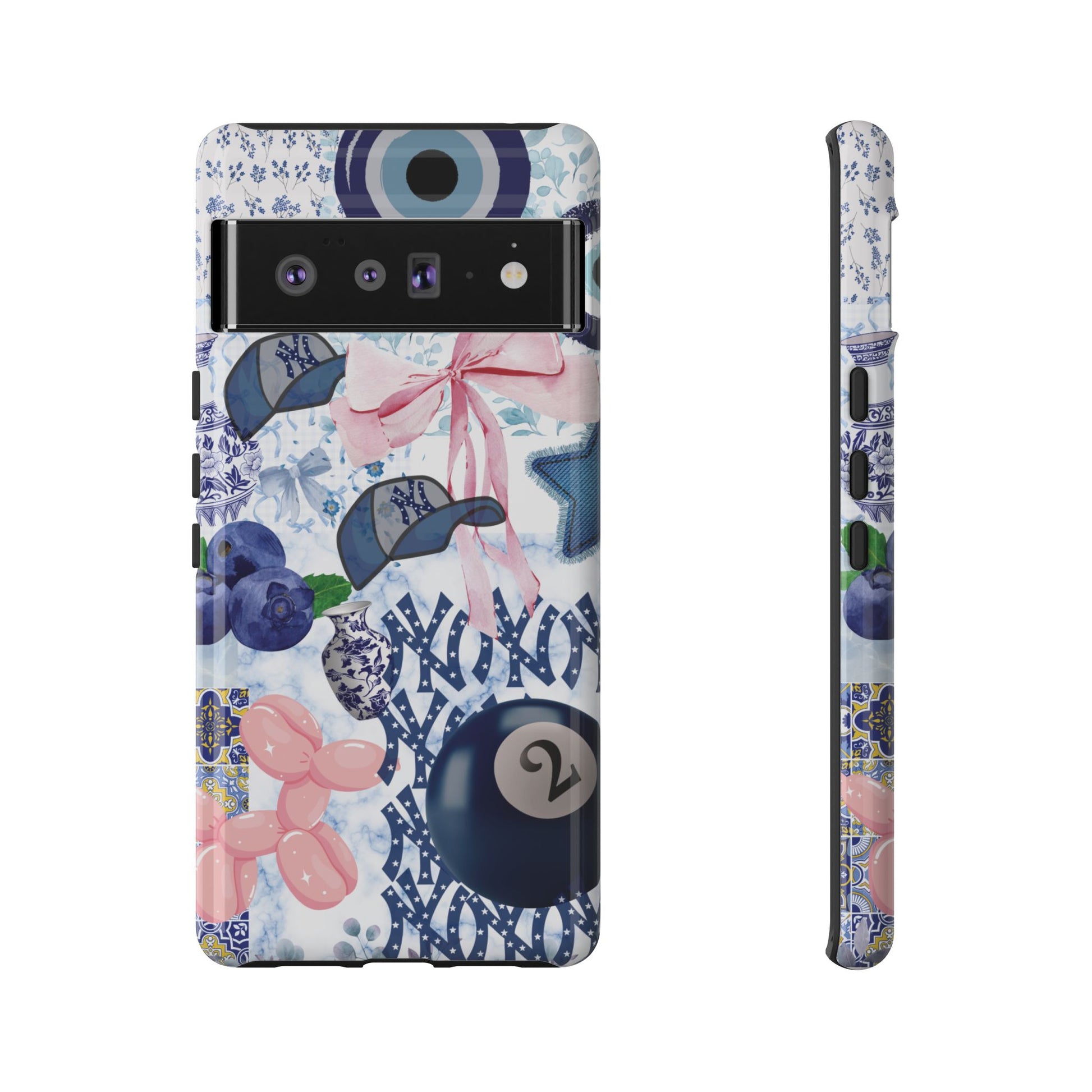 Embrace your playful side with the "Coy Couture" phone case. This whimsical design features a delightful mix of playful elements like a pink bow, a baseball cap, blueberries, and a pink balloon, all set against a backdrop of charming patterns. The "Coy Couture" phone case is perfect for those who love playful and unique designs. It's a stylish and fun way to add a touch of whimsy to your everyday look.