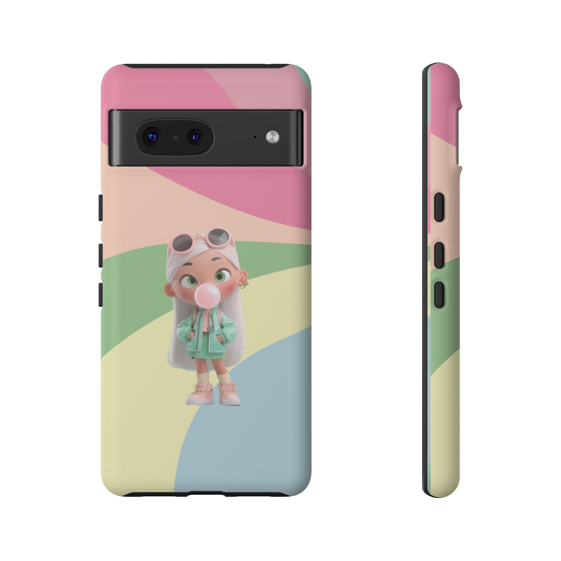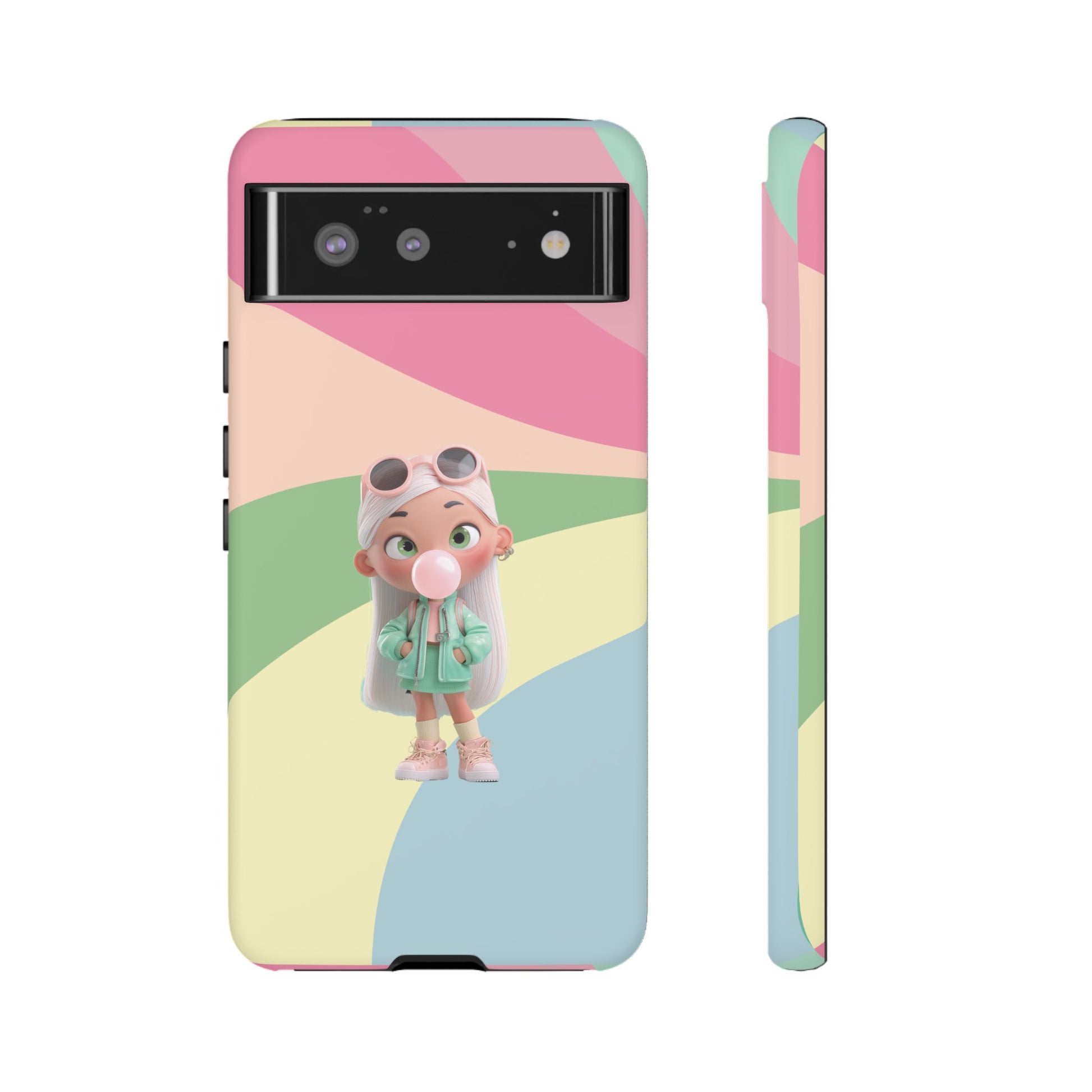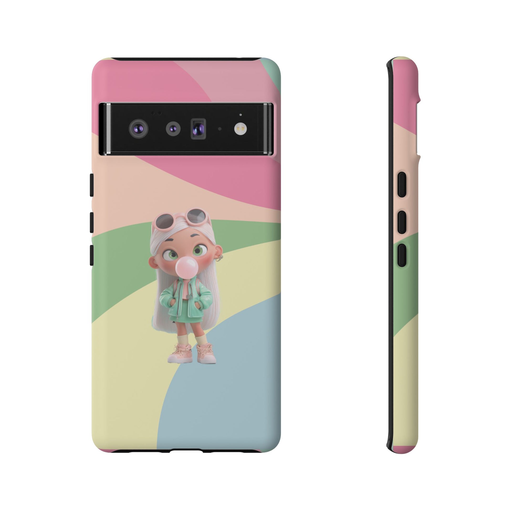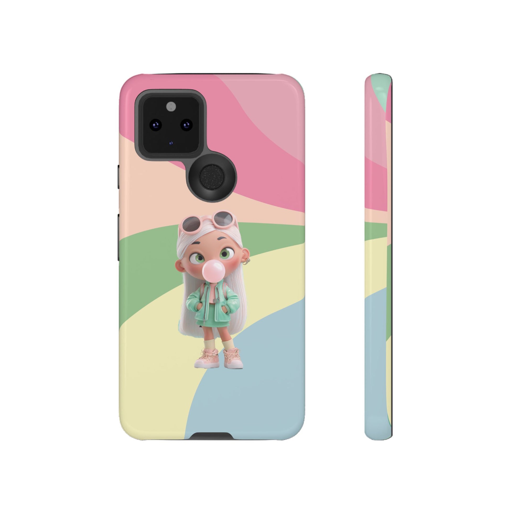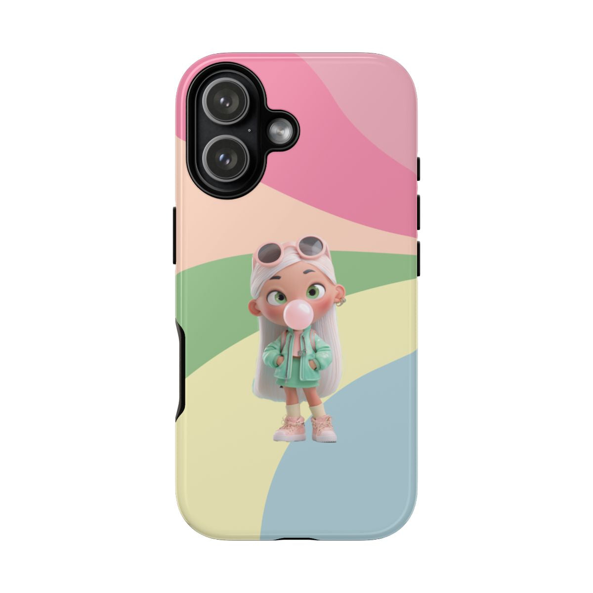 Float into a world of dreamy colors with the "Dream Swirl" phone case! This charming design features an irresistibly cute doll blowing a vibrant pink bubblegum bubble, complete with stylish sunglasses and long white hair. She stands against a soft, wavy background of pastel pink, peach, mint green, light yellow, and baby blue, creating a sweet, playful, and trendy aesthetic. It's the perfect accessory to add a touch of whimsy and retro charm to your everyday look, making every moment feel a little more dreamlike.