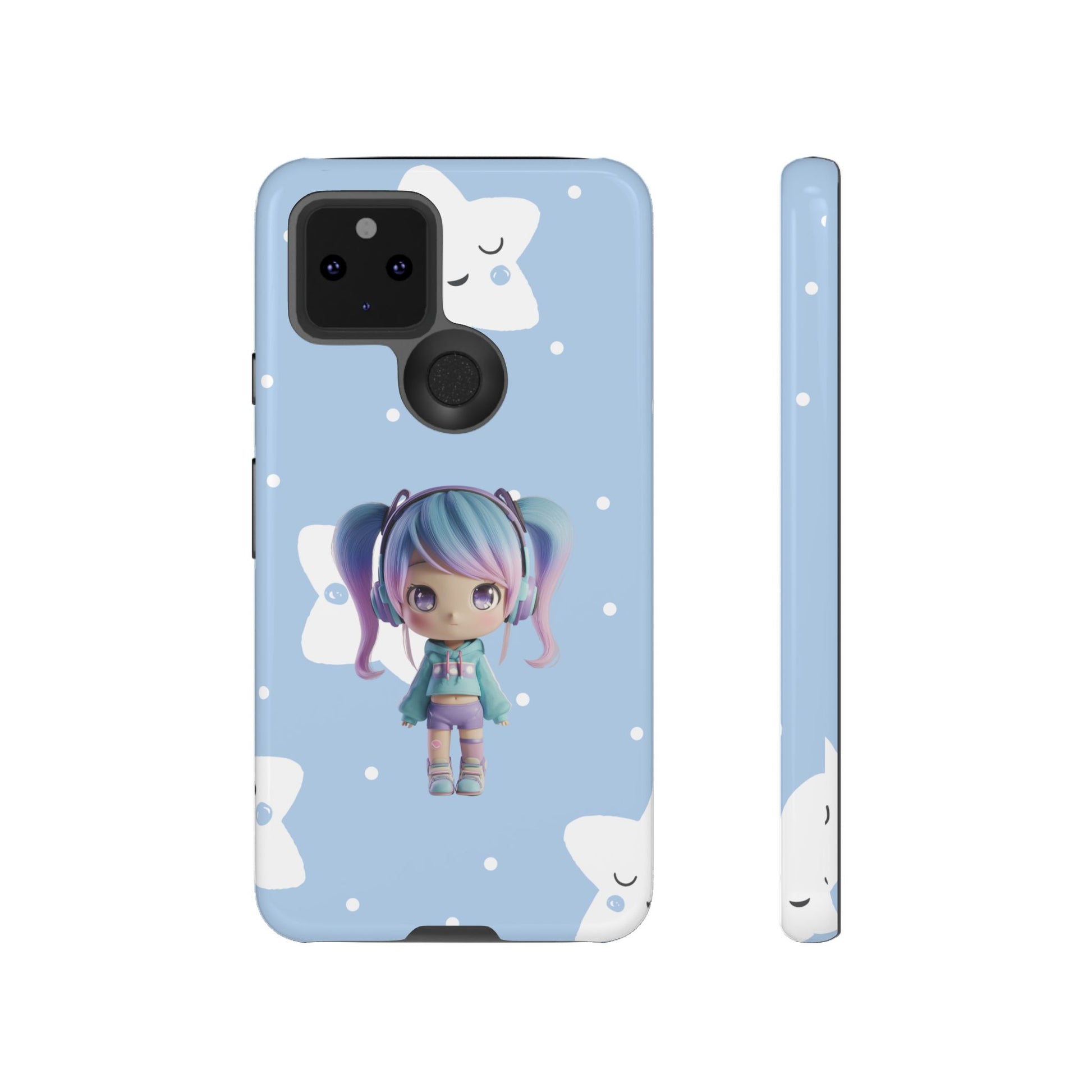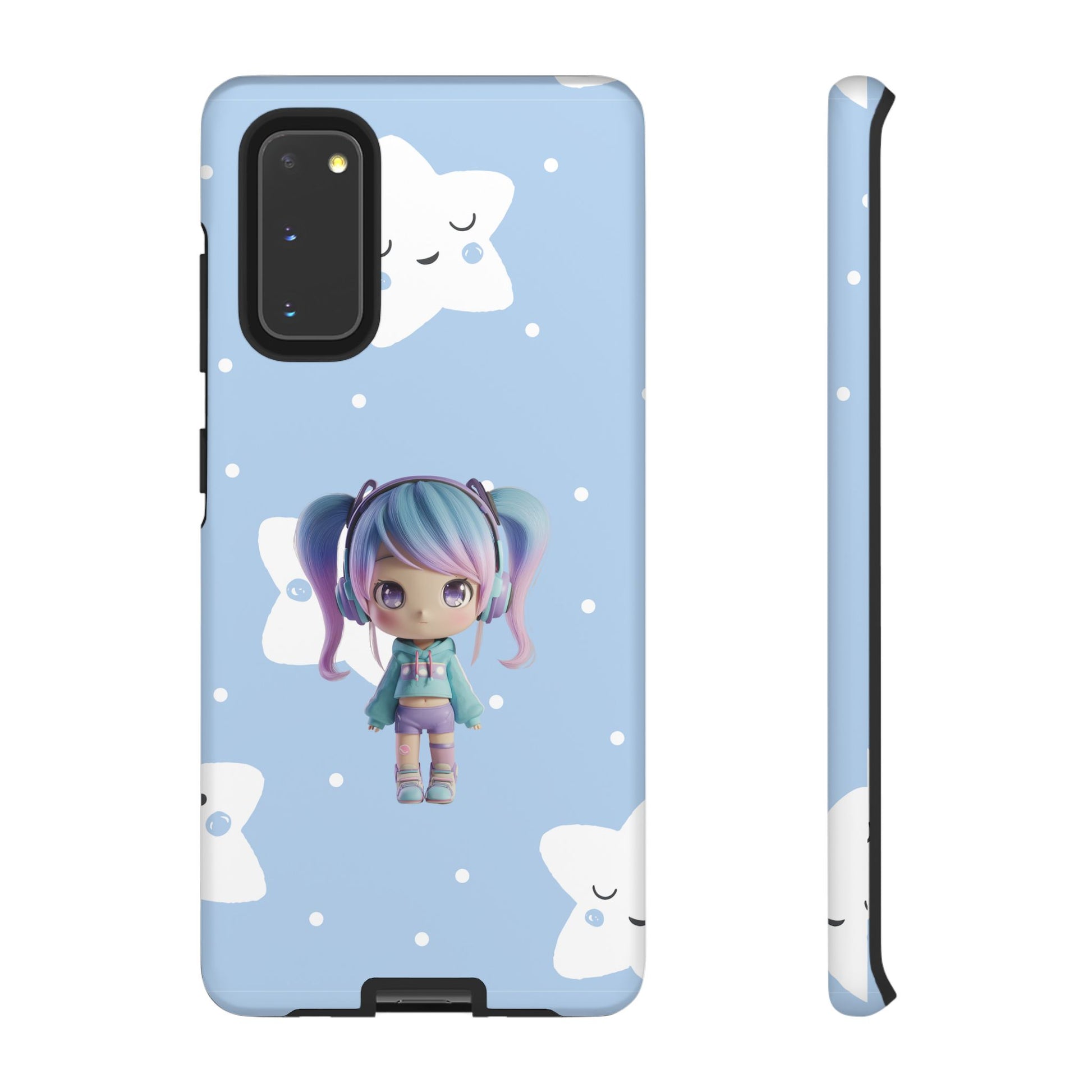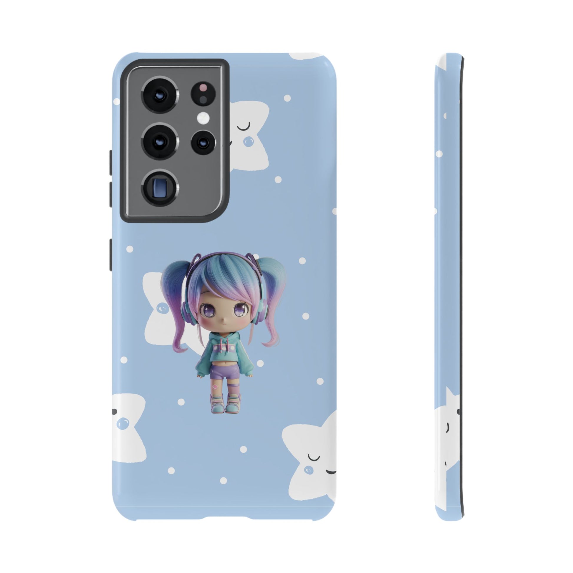 Tune into adorable vibes with the "Dreamy Tunes" phone case! This charming design features an irresistibly cute doll with vibrant pastel pink and blue pigtails, sporting stylish headphones and a cozy hoodie. She is set against a serene light blue background dotted with cheerful white smiling stars and soft white polka dots, creating a whimsical and musical dreamscape that's perfect for anyone who loves their tunes and a touch of magic.
