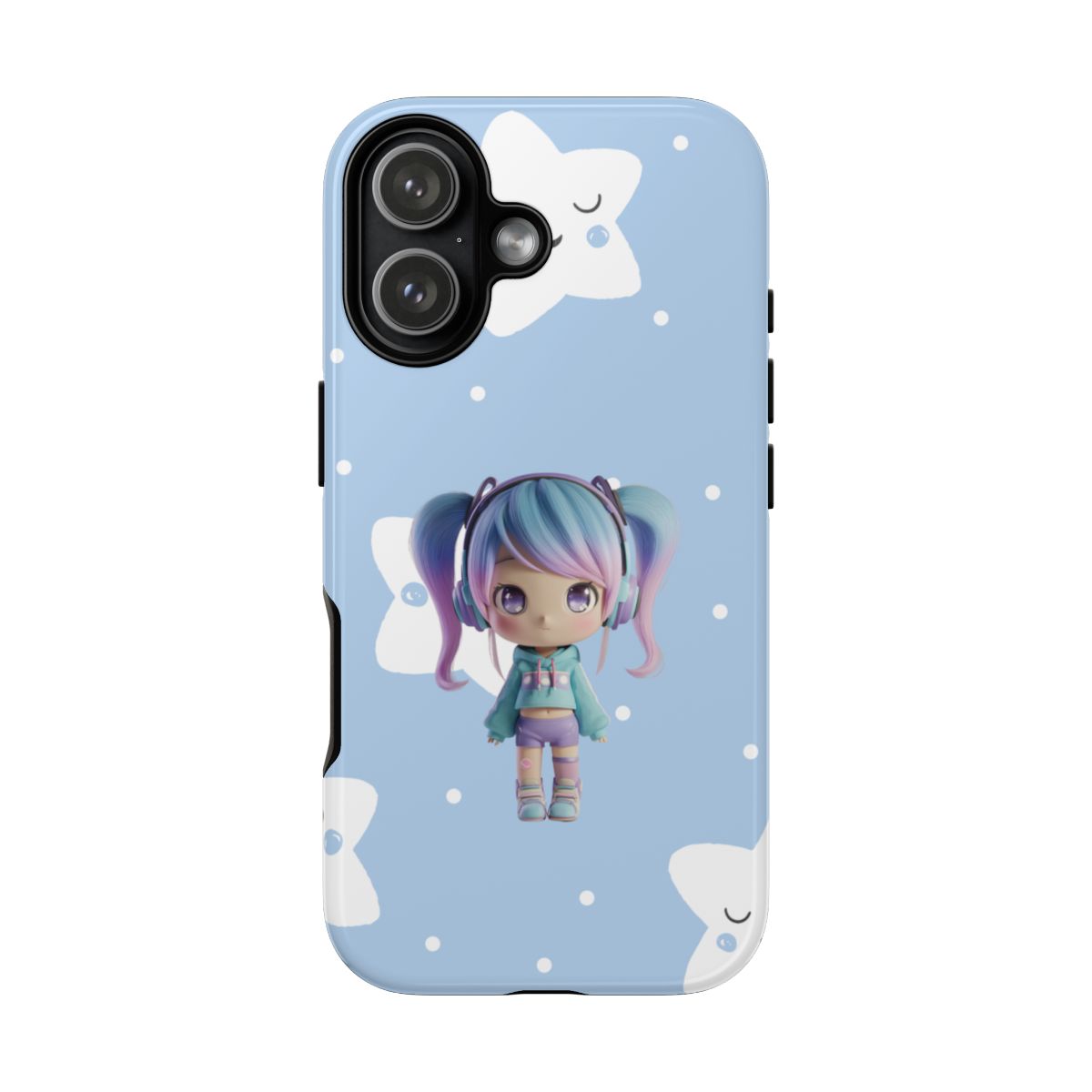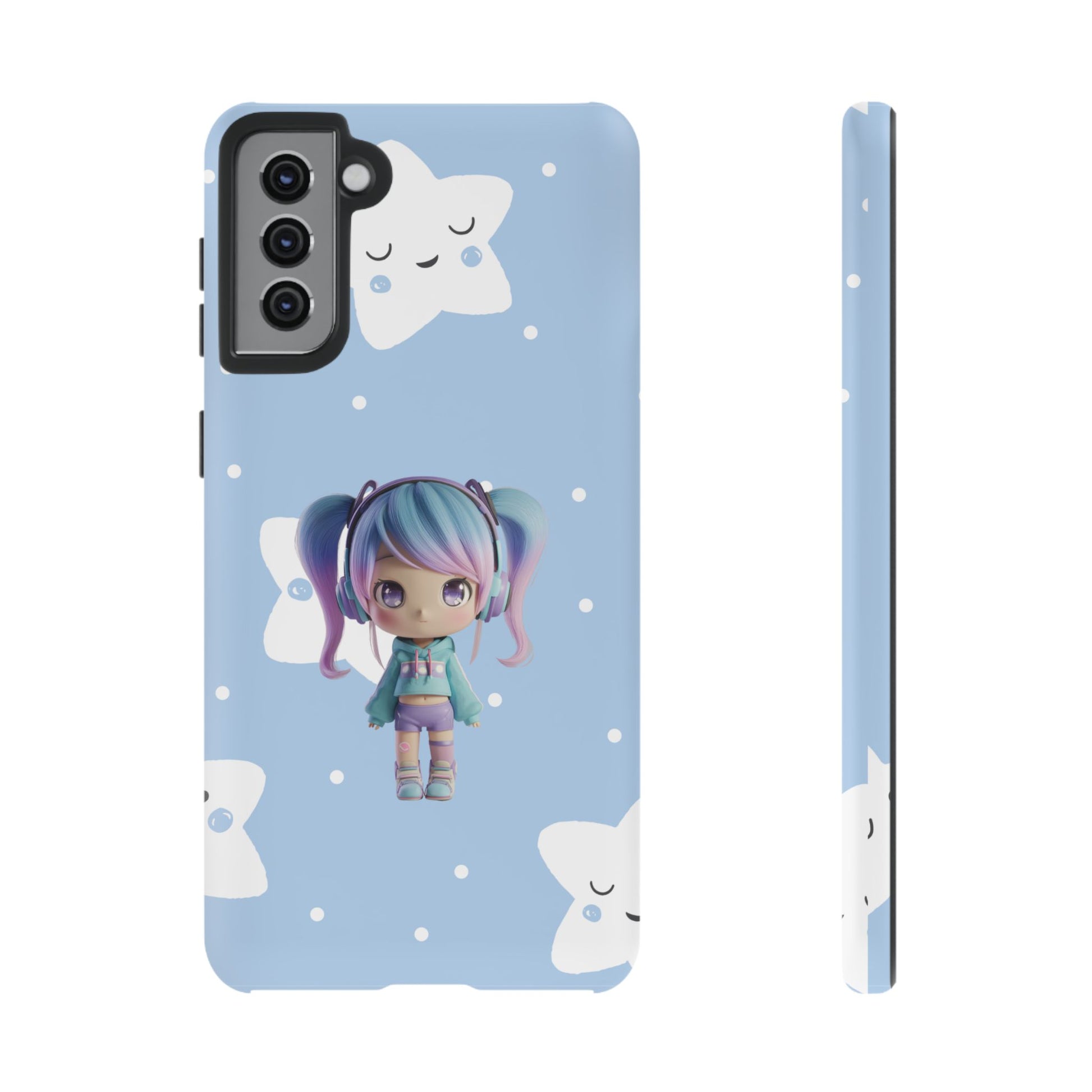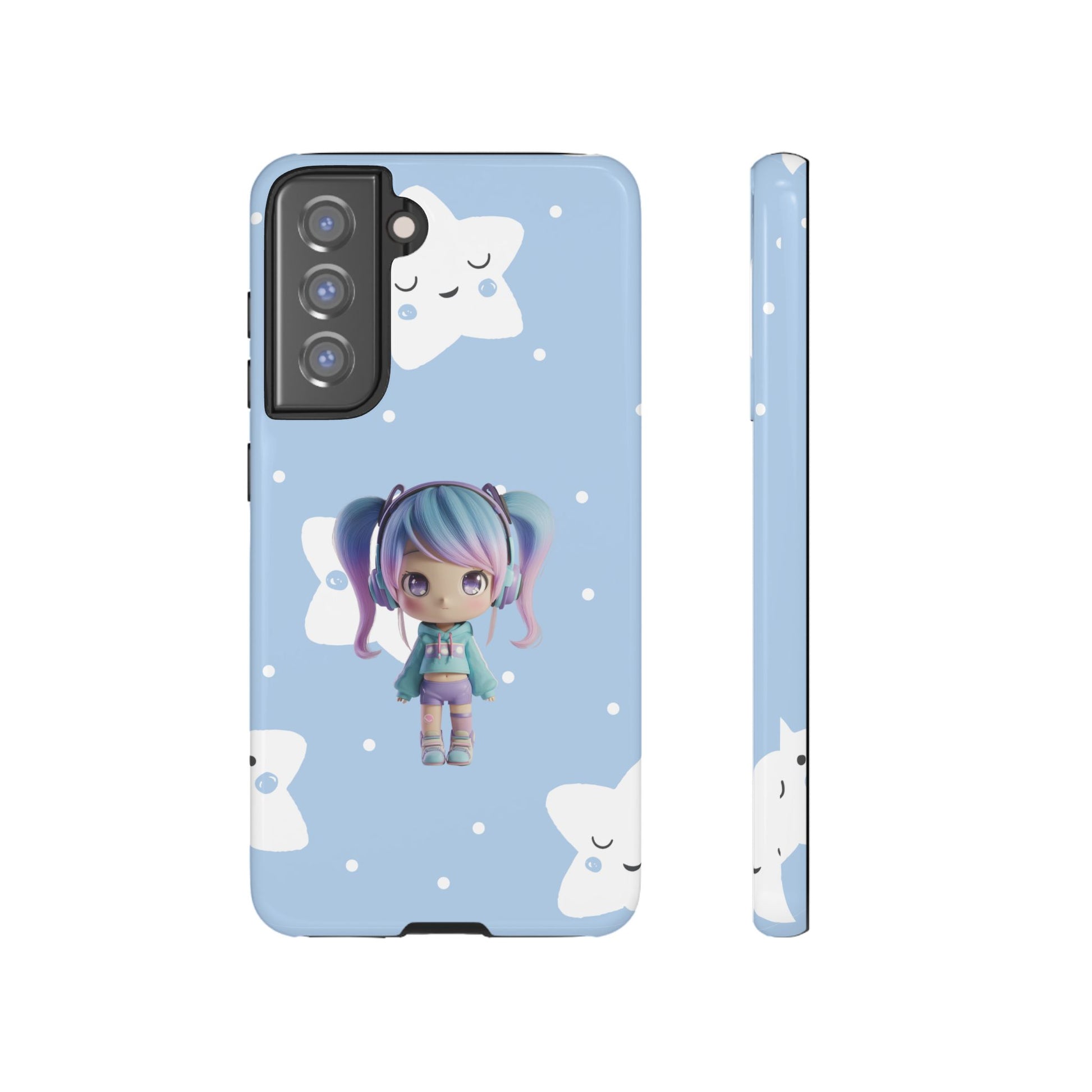 Tune into adorable vibes with the "Dreamy Tunes" phone case! This charming design features an irresistibly cute doll with vibrant pastel pink and blue pigtails, sporting stylish headphones and a cozy hoodie. She is set against a serene light blue background dotted with cheerful white smiling stars and soft white polka dots, creating a whimsical and musical dreamscape that's perfect for anyone who loves their tunes and a touch of magic.