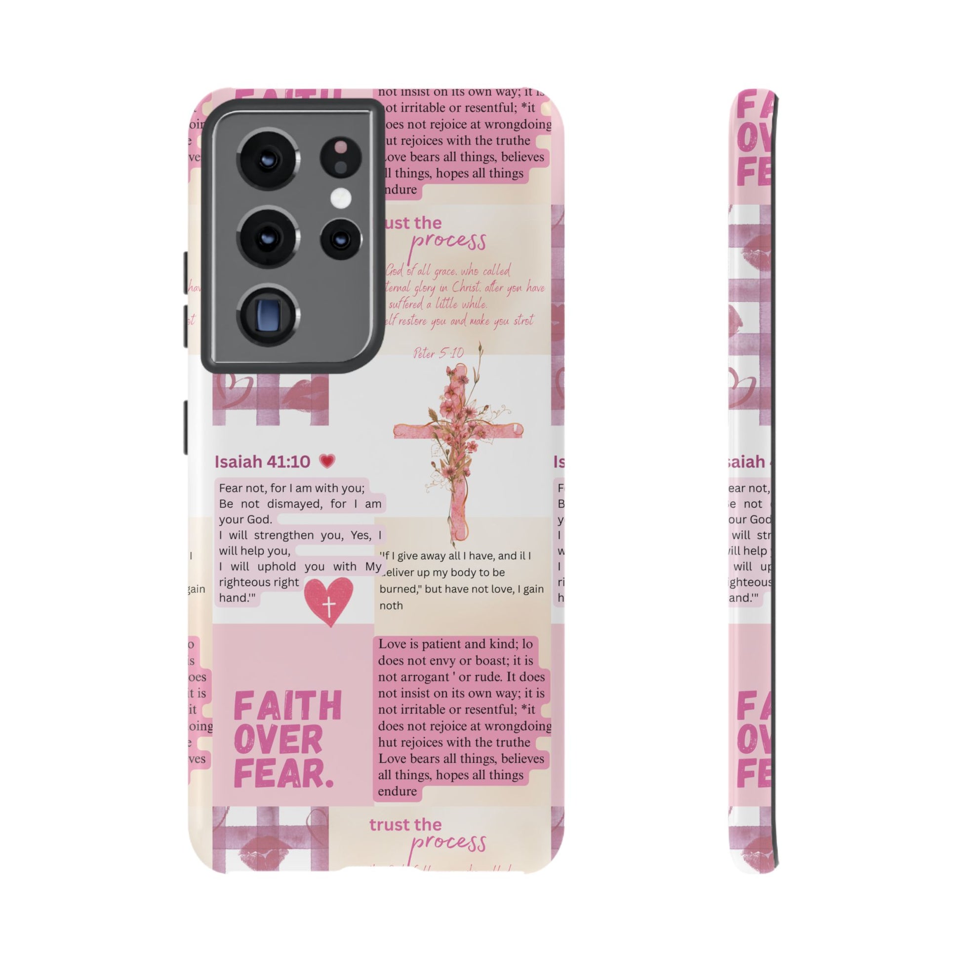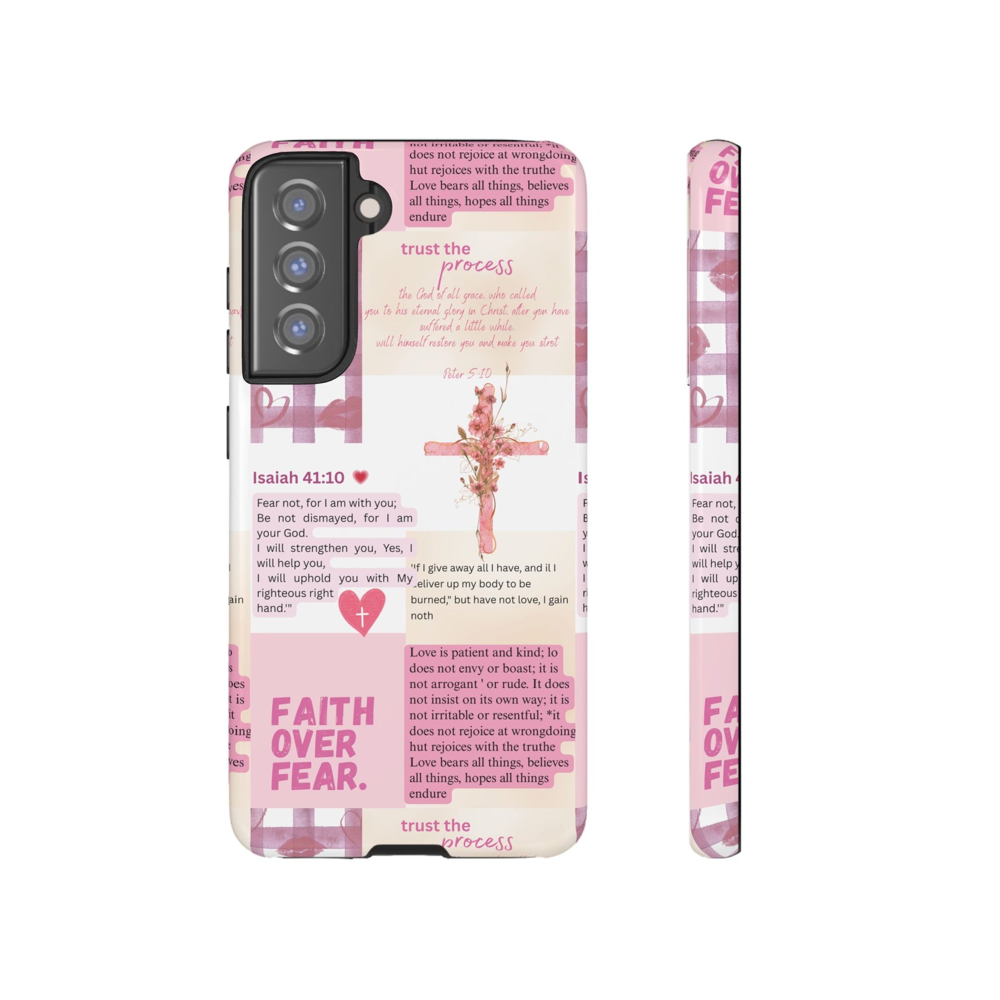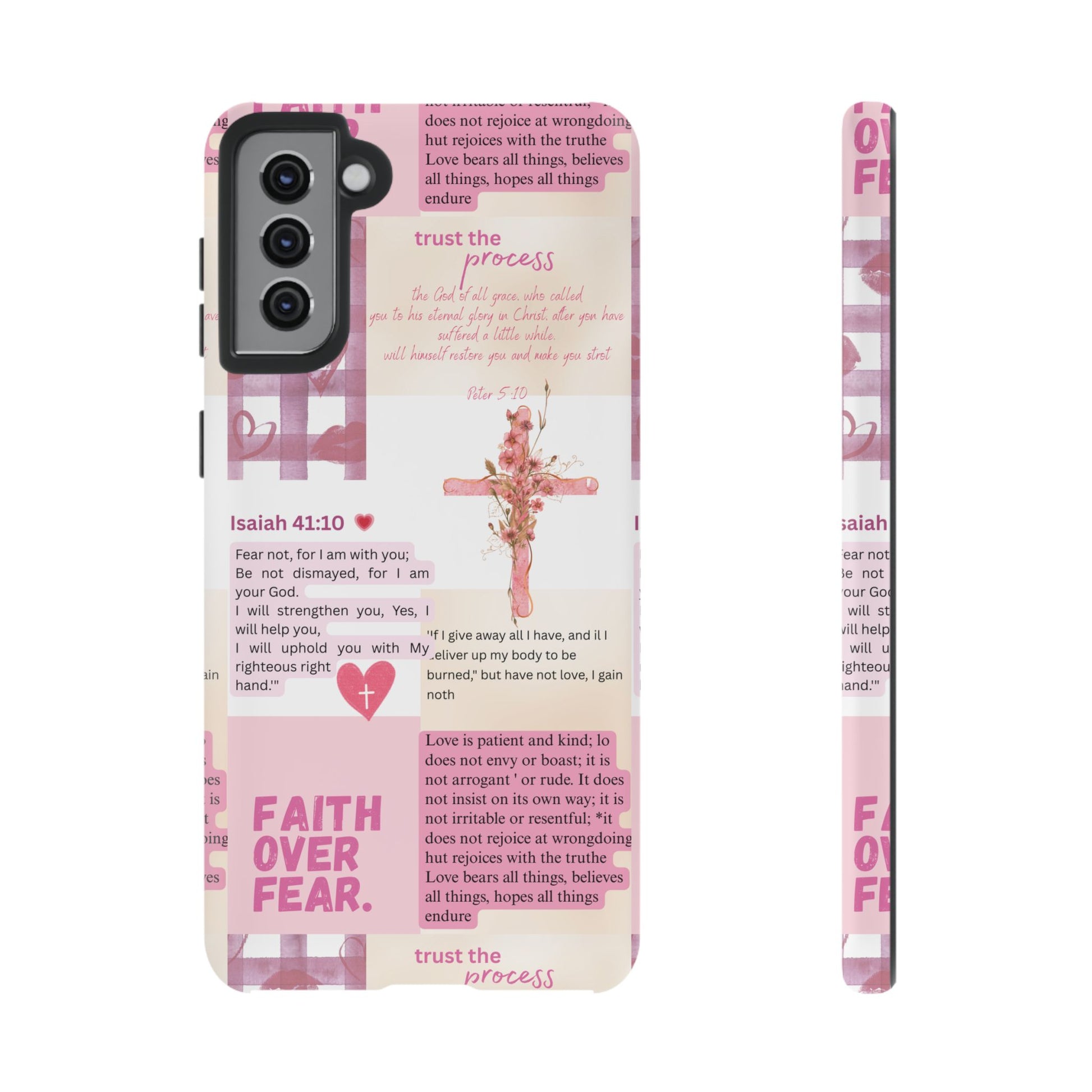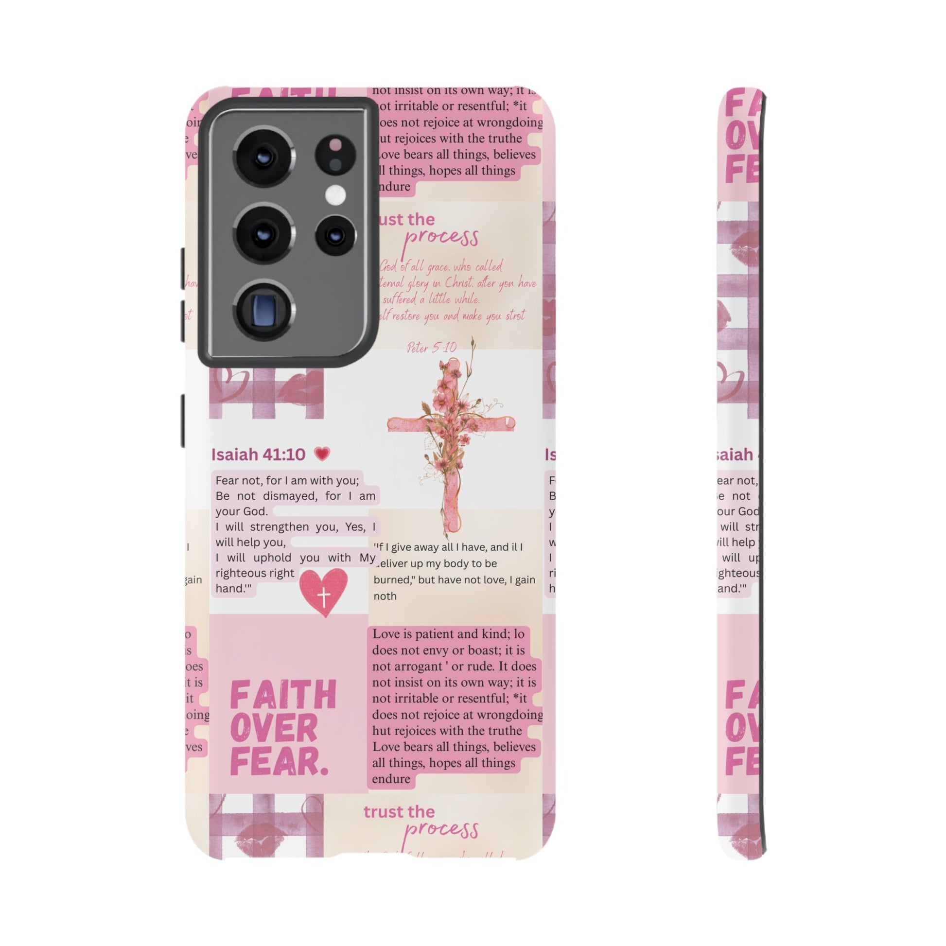 Carry a daily reminder of strength and hope with the "Faith Over Fear" phone case. This inspiring design beautifully combines a collection of uplifting scriptures, a delicate pink watercolor cross, and positive affirmations on a soft pink and white background. The powerful message "FAITH OVER FEAR" stands out, alongside verses like "Isaiah 41:10" and a timeless quote on love from 1 Corinthians 13. It's a serene and meaningful accessory to help you trust the process and find peace in your faith.