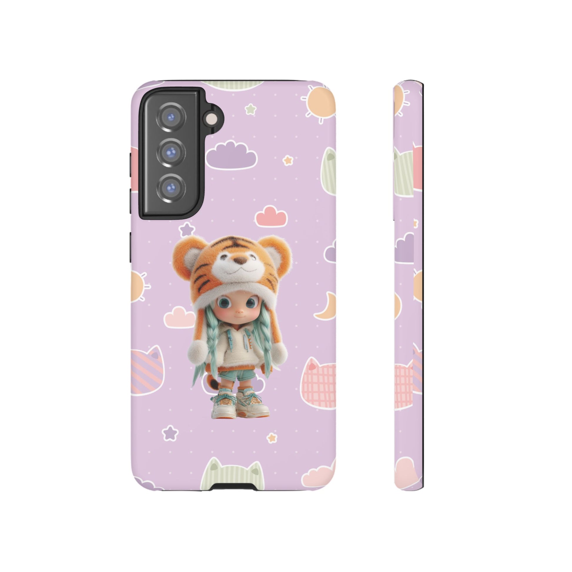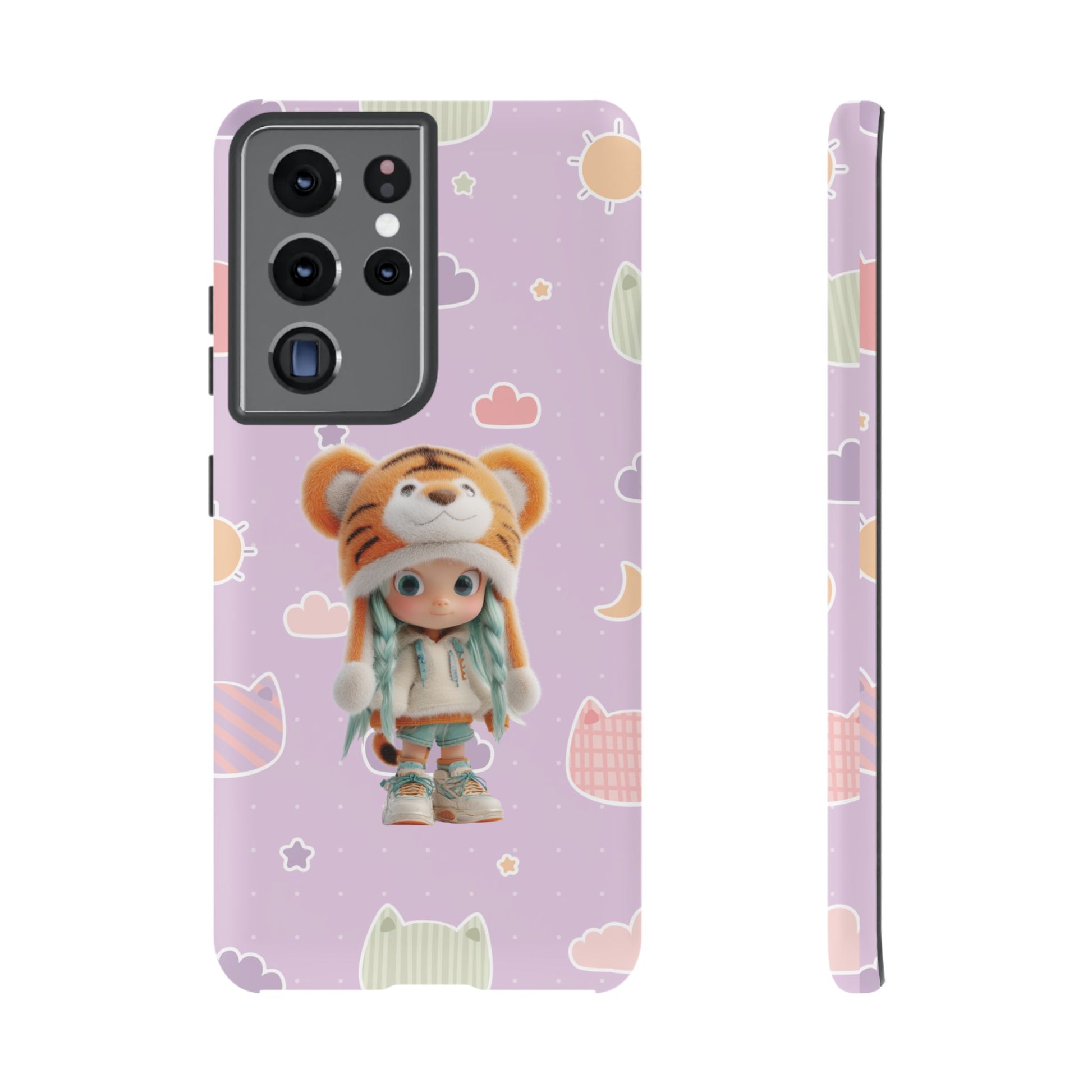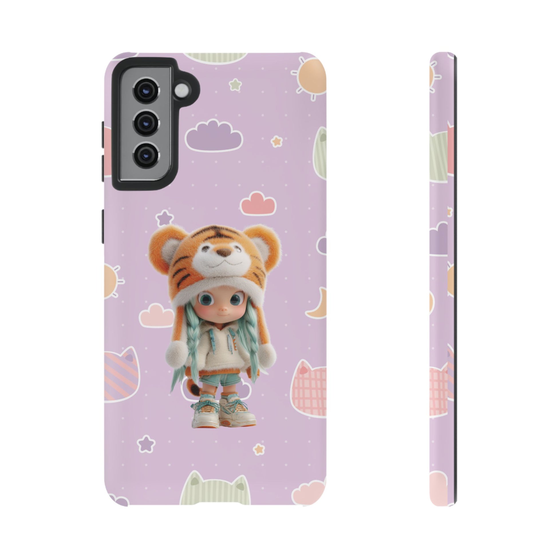 Unleash a roar of cuteness with our "Lavender Tiger Tot" phone case! This enchanting design features an adorable doll with mint green pigtails, charmingly dressed in a fluffy tiger hat and cozy outfit. She stands amidst a dreamy lavender backdrop playfully adorned with pastel cat heads, soft clouds, and twinkling stars. It's a whimsical and utterly unique accessory that blends wild charm with sweet, dreamy vibes, perfect for adding a touch of adorable adventure to your everyday.