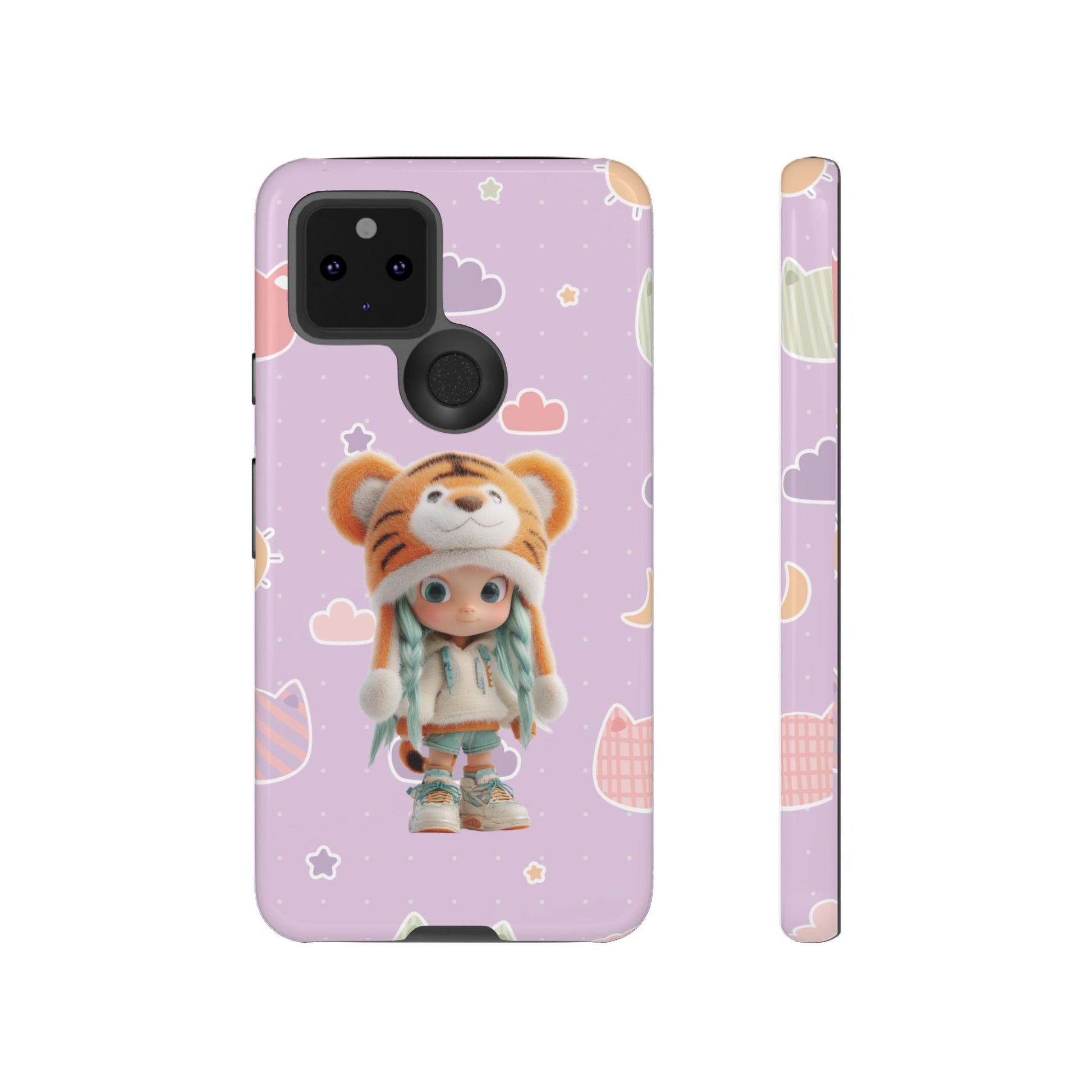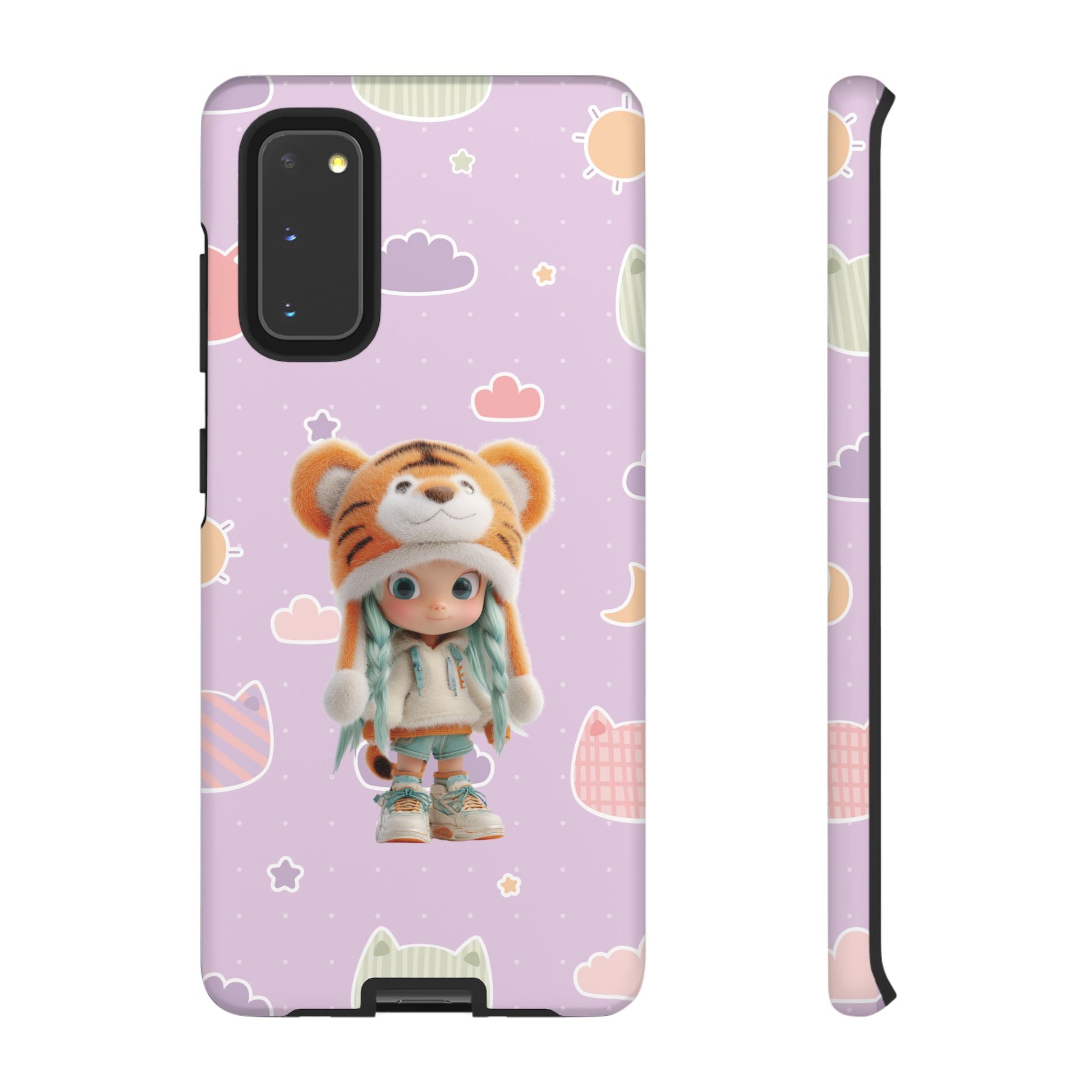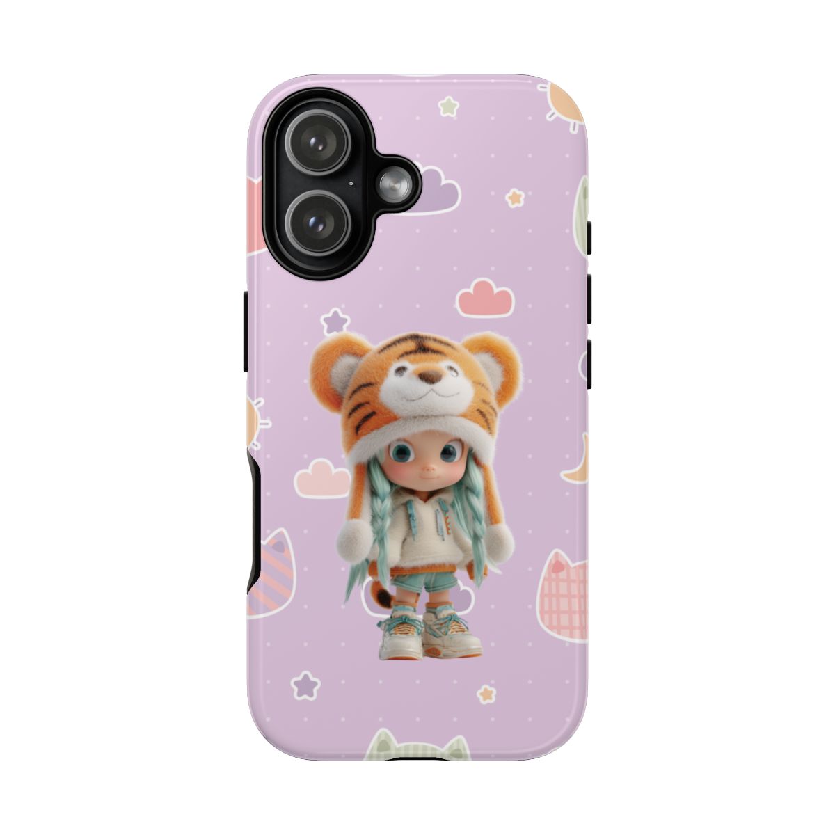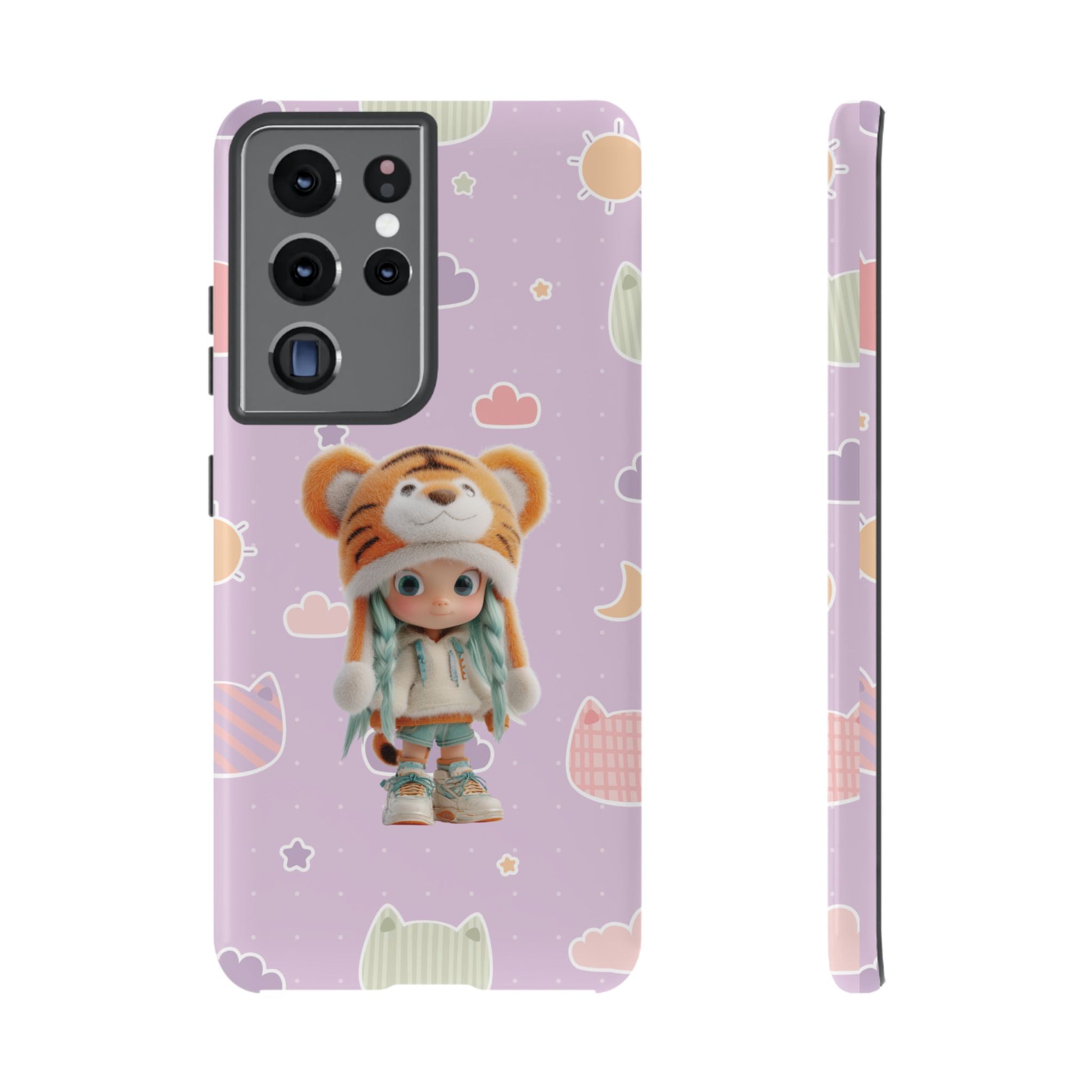 Unleash a roar of cuteness with our "Lavender Tiger Tot" phone case! This enchanting design features an adorable doll with mint green pigtails, charmingly dressed in a fluffy tiger hat and cozy outfit. She stands amidst a dreamy lavender backdrop playfully adorned with pastel cat heads, soft clouds, and twinkling stars. It's a whimsical and utterly unique accessory that blends wild charm with sweet, dreamy vibes, perfect for adding a touch of adorable adventure to your everyday.
