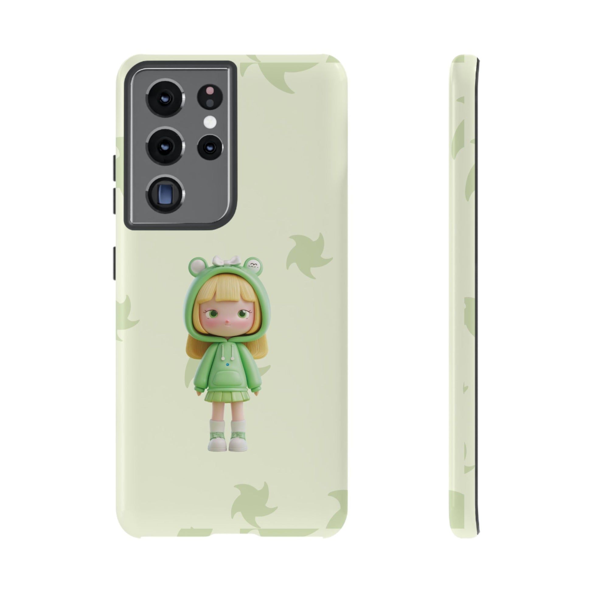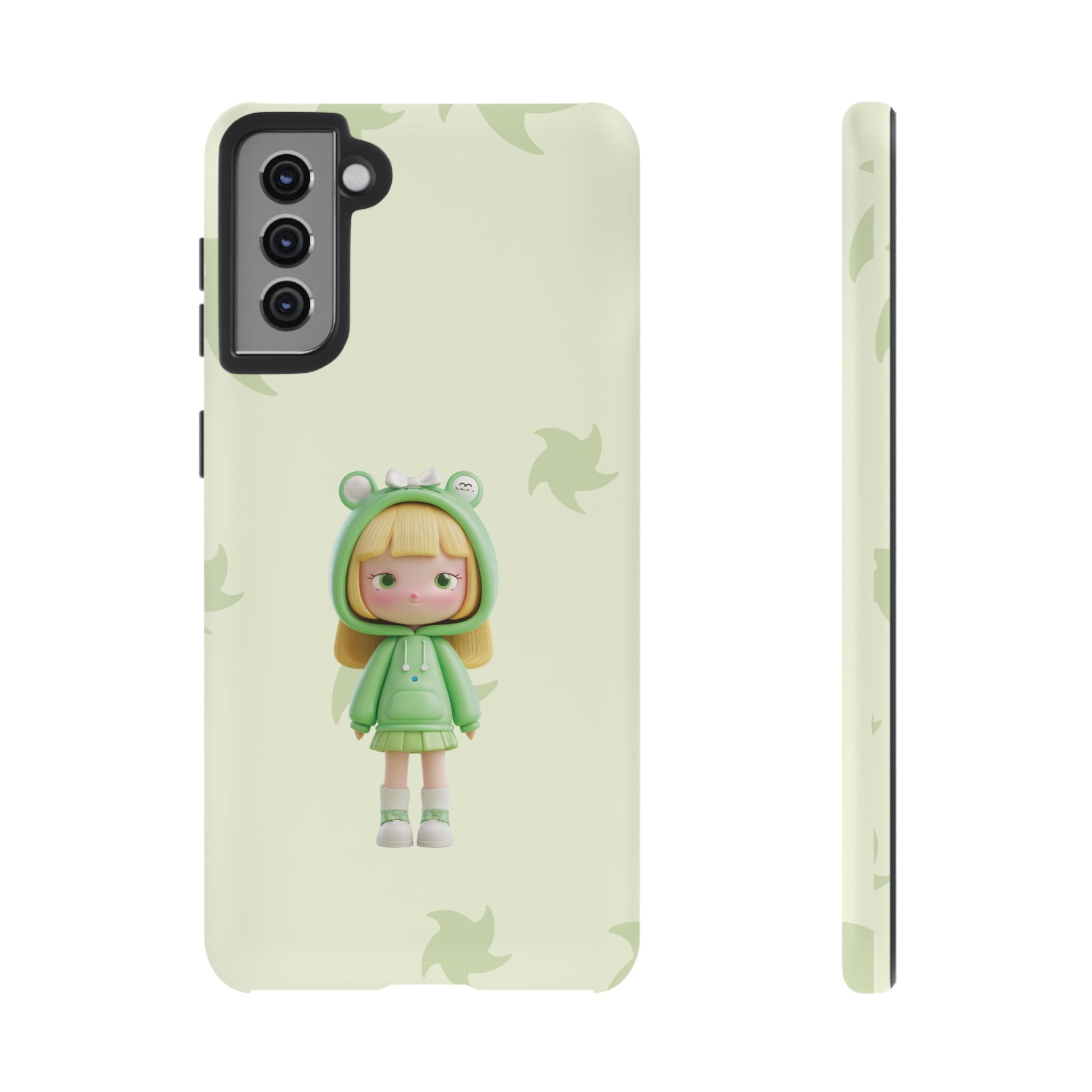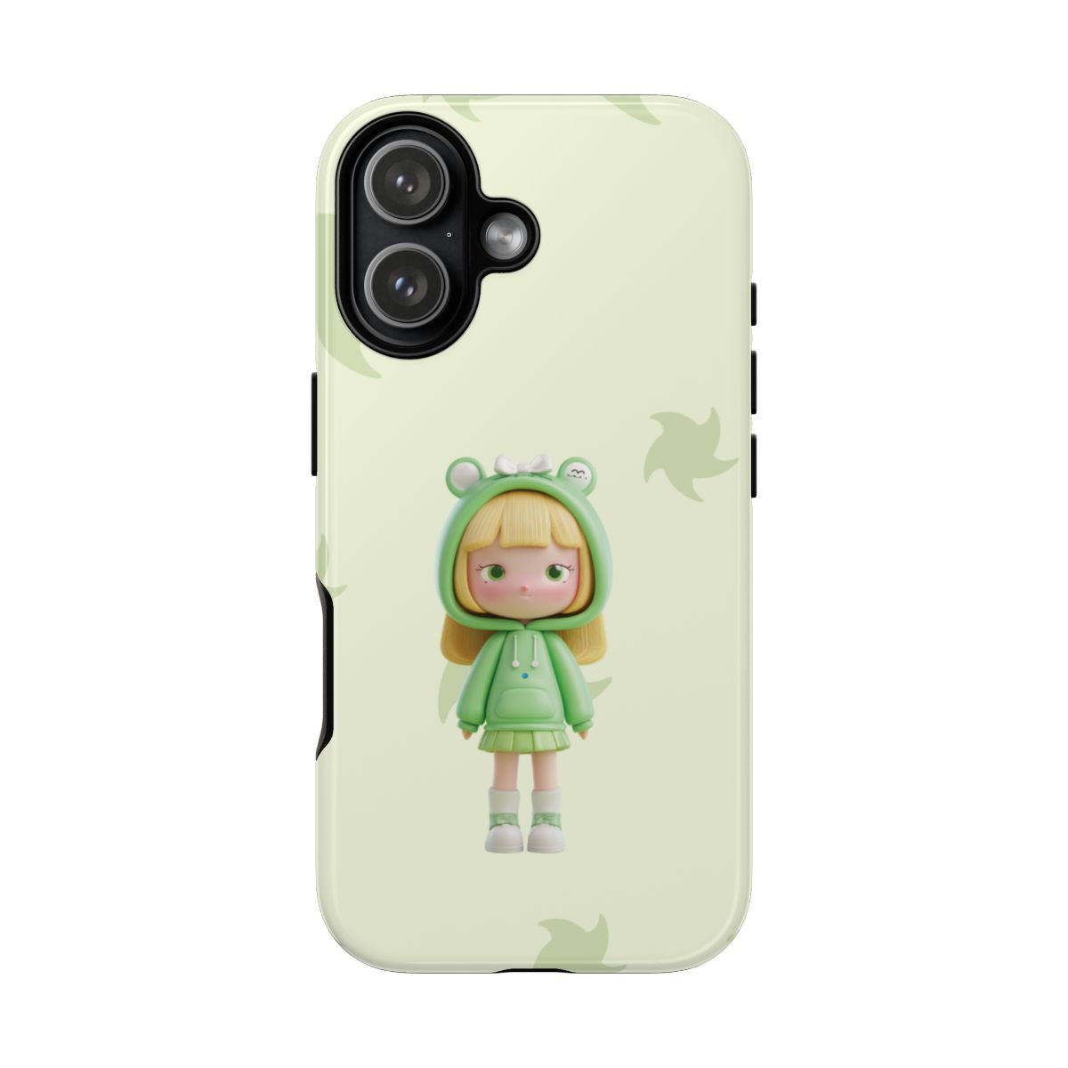 Hop into charming style with the "Leafy Loof" phone case! This adorable design features a sweet doll with blonde hair, dressed in a cozy green frog hoodie with little ears. She stands against a soft, light green background playfully adorned with subtle, abstract leaf shapes, creating a whimsical and nature-inspired aesthetic. It's the perfect accessory to add a touch of innocent charm and playful cuteness to your everyday look, making your phone feel like a little green friend.
