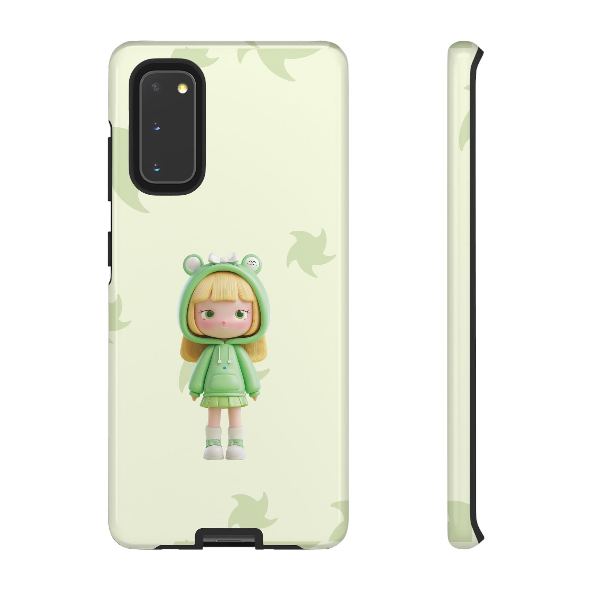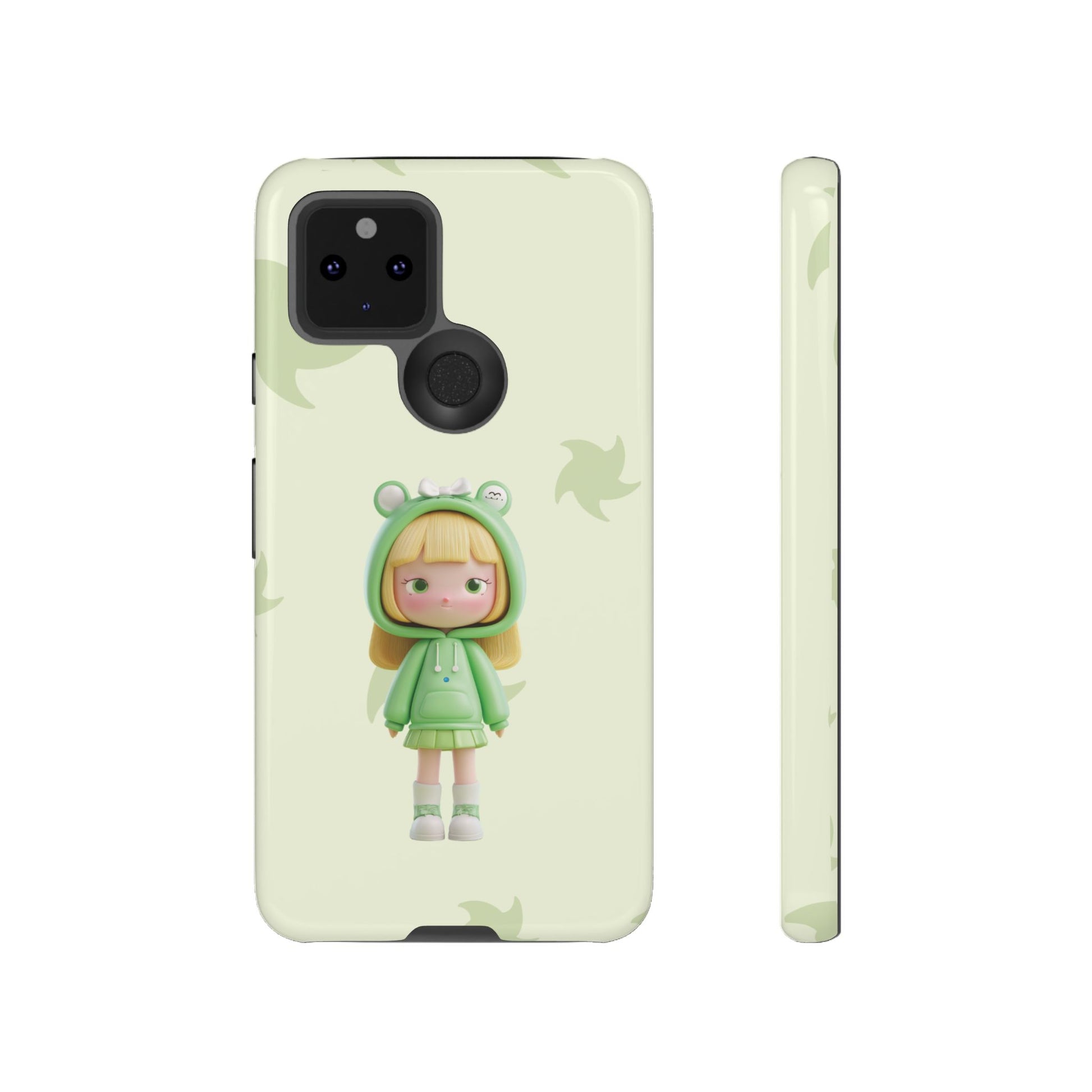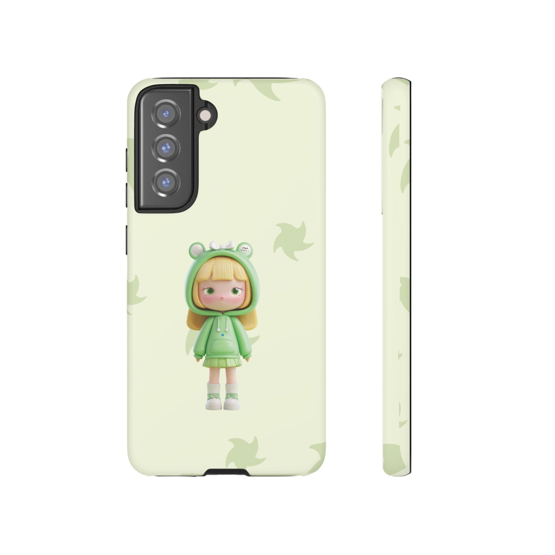 Hop into charming style with the "Leafy Loof" phone case! This adorable design features a sweet doll with blonde hair, dressed in a cozy green frog hoodie with little ears. She stands against a soft, light green background playfully adorned with subtle, abstract leaf shapes, creating a whimsical and nature-inspired aesthetic. It's the perfect accessory to add a touch of innocent charm and playful cuteness to your everyday look, making your phone feel like a little green friend.