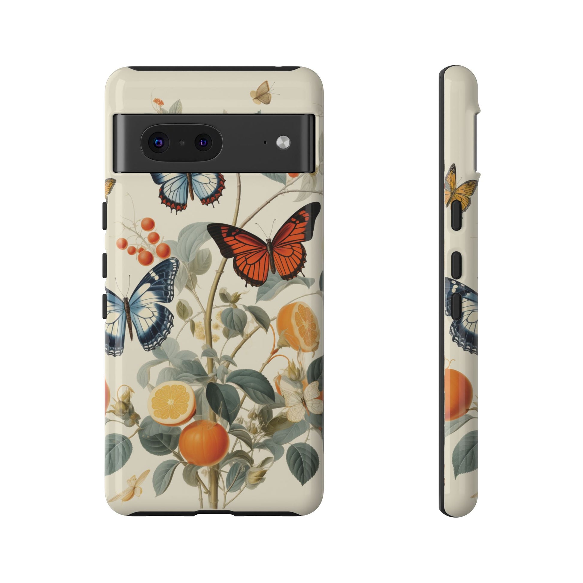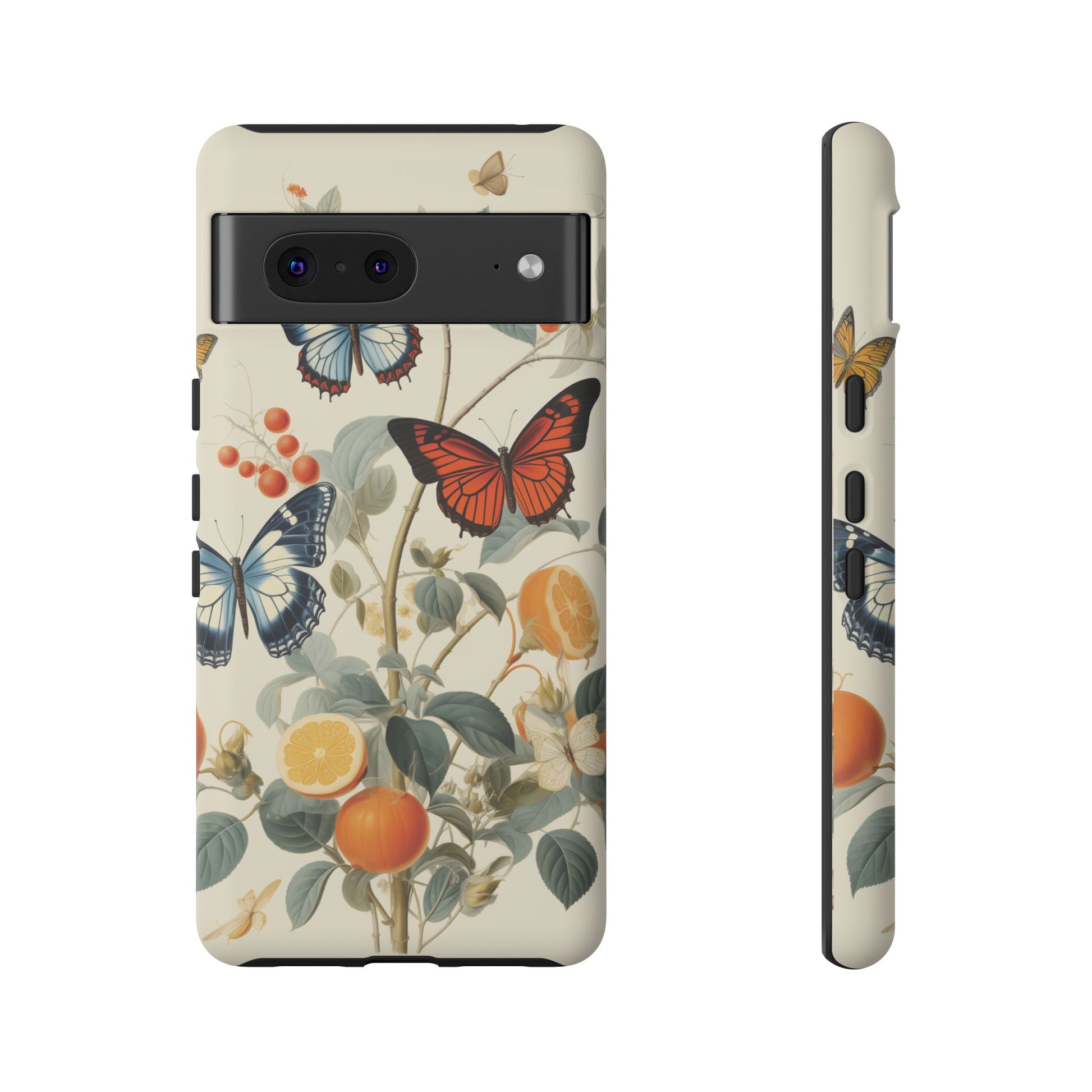 Embrace the beauty of nature with the "Butterfly Bloom" phone case. This enchanting design features a vibrant array of butterflies fluttering amongst blooming flowers and juicy citrus fruits, creating a captivating and vibrant look. The "Butterfly Bloom" phone case is perfect for anyone who appreciates nature and vibrant designs. It's a stylish and fun way to add a touch of beauty and whimsy to your everyday look.
