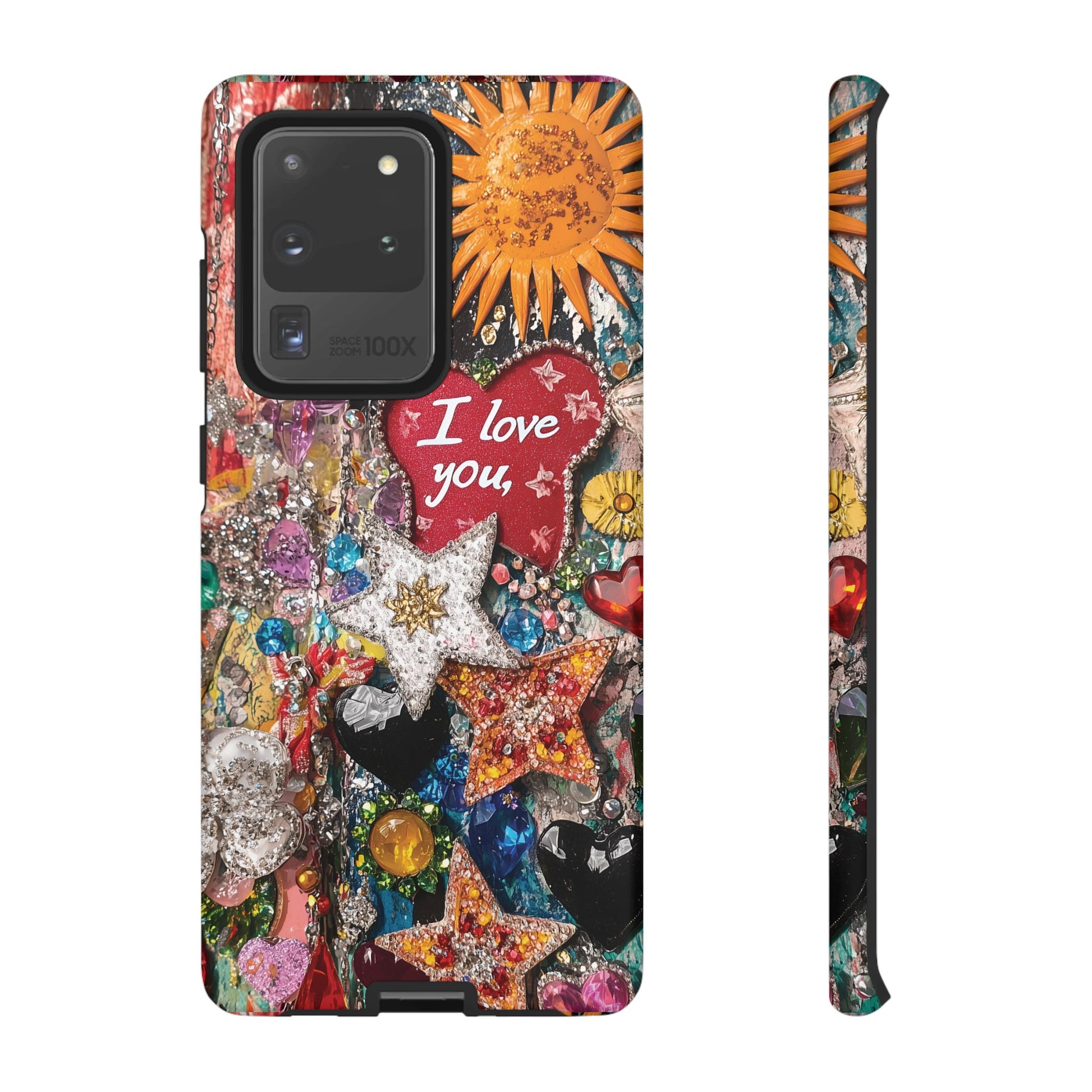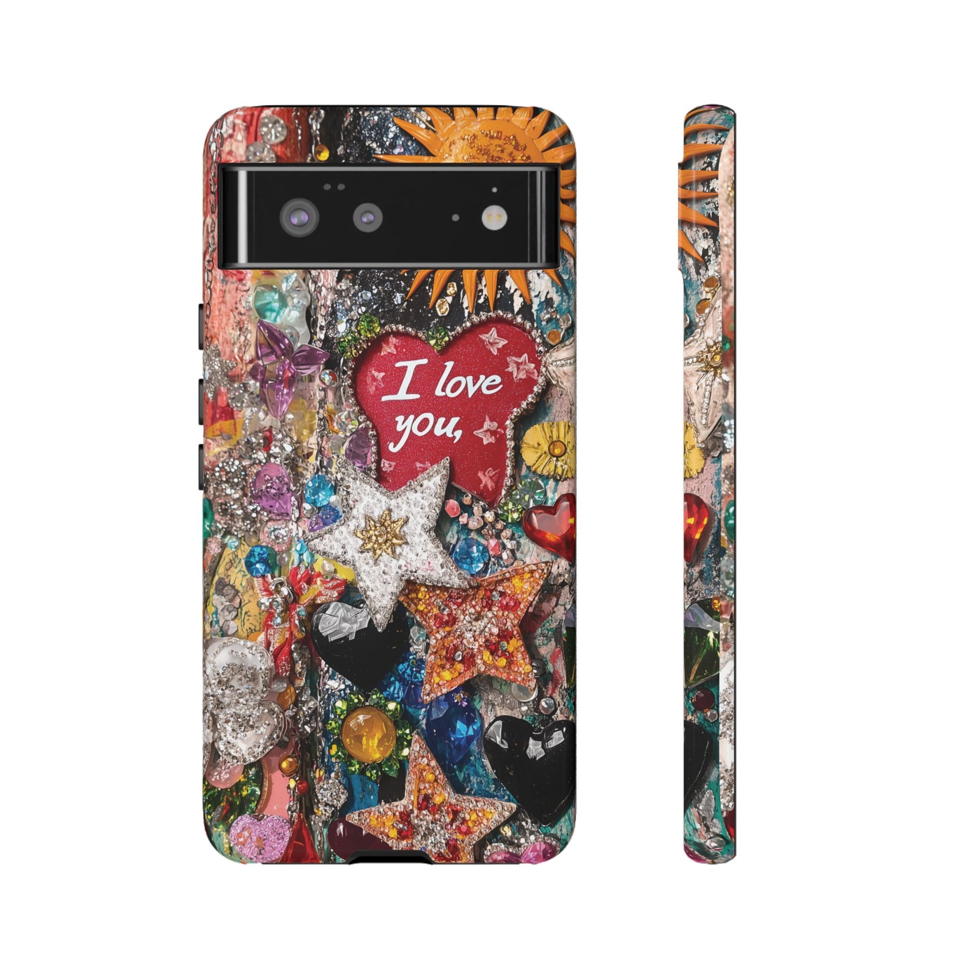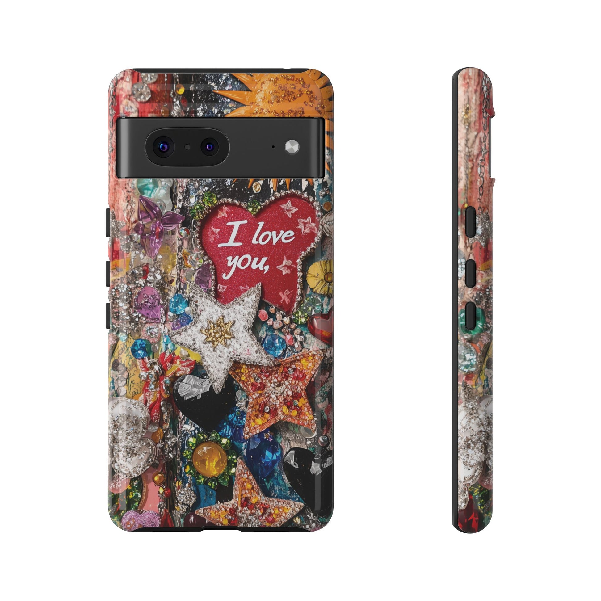 Express your love under a celestial sky with the "Starlight Mosaic" phone case. This unique design features a vibrant mosaic of textures, colors, and sparkling elements, centered around a heartfelt "I love you" message and adorned with twinkling stars. The "Starlight Mosaic" phone case is perfect for those who want to express their love in a unique and artistic way. It's a stylish and heartfelt way to add a personal touch to your everyday look and carry a piece of the starry sky with you.