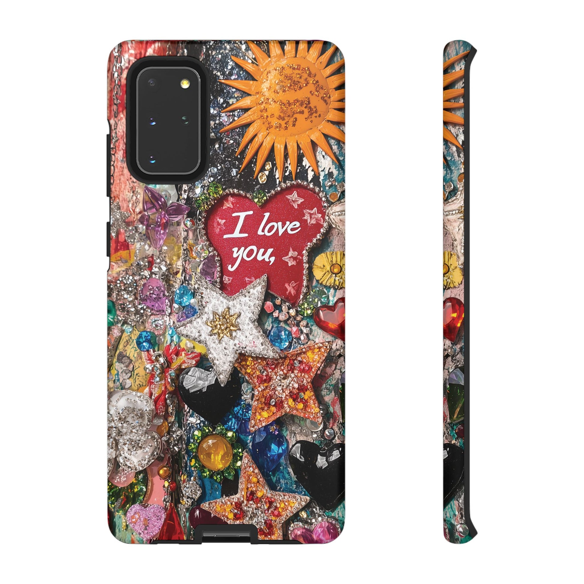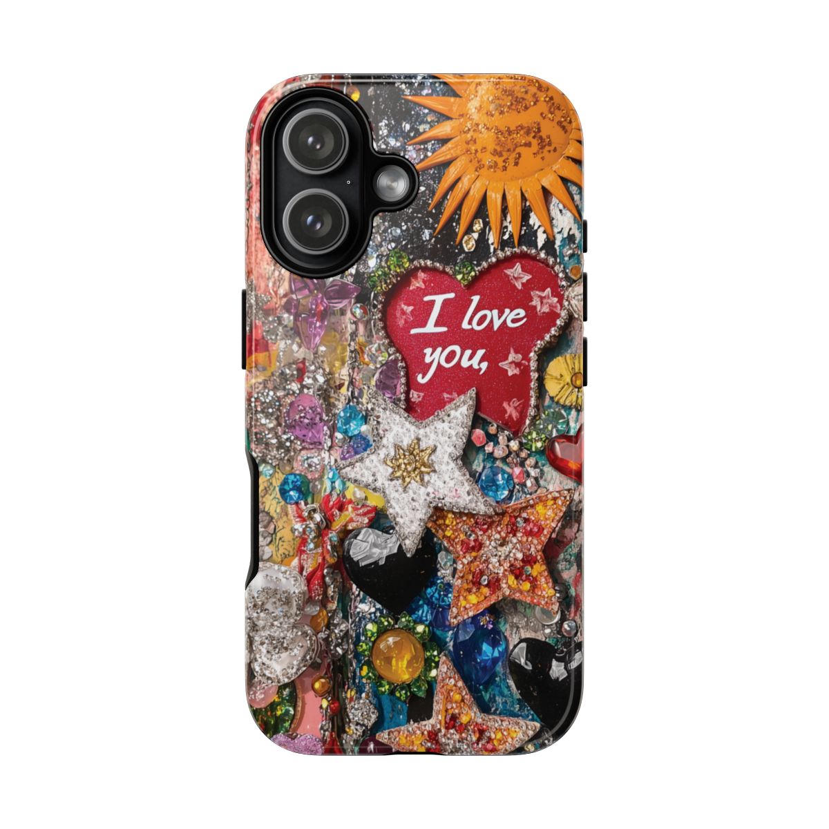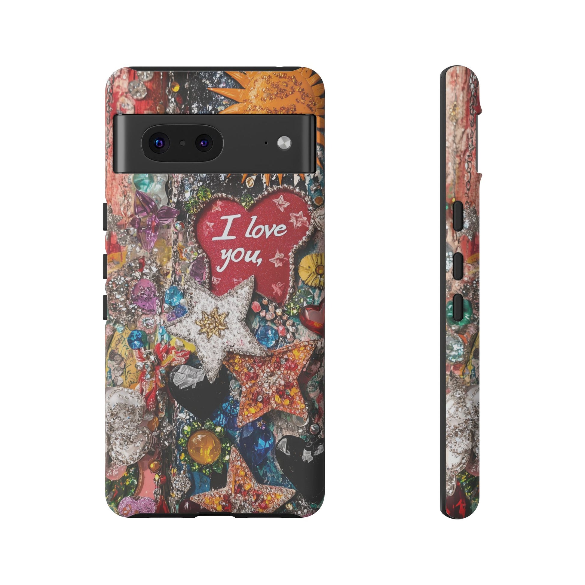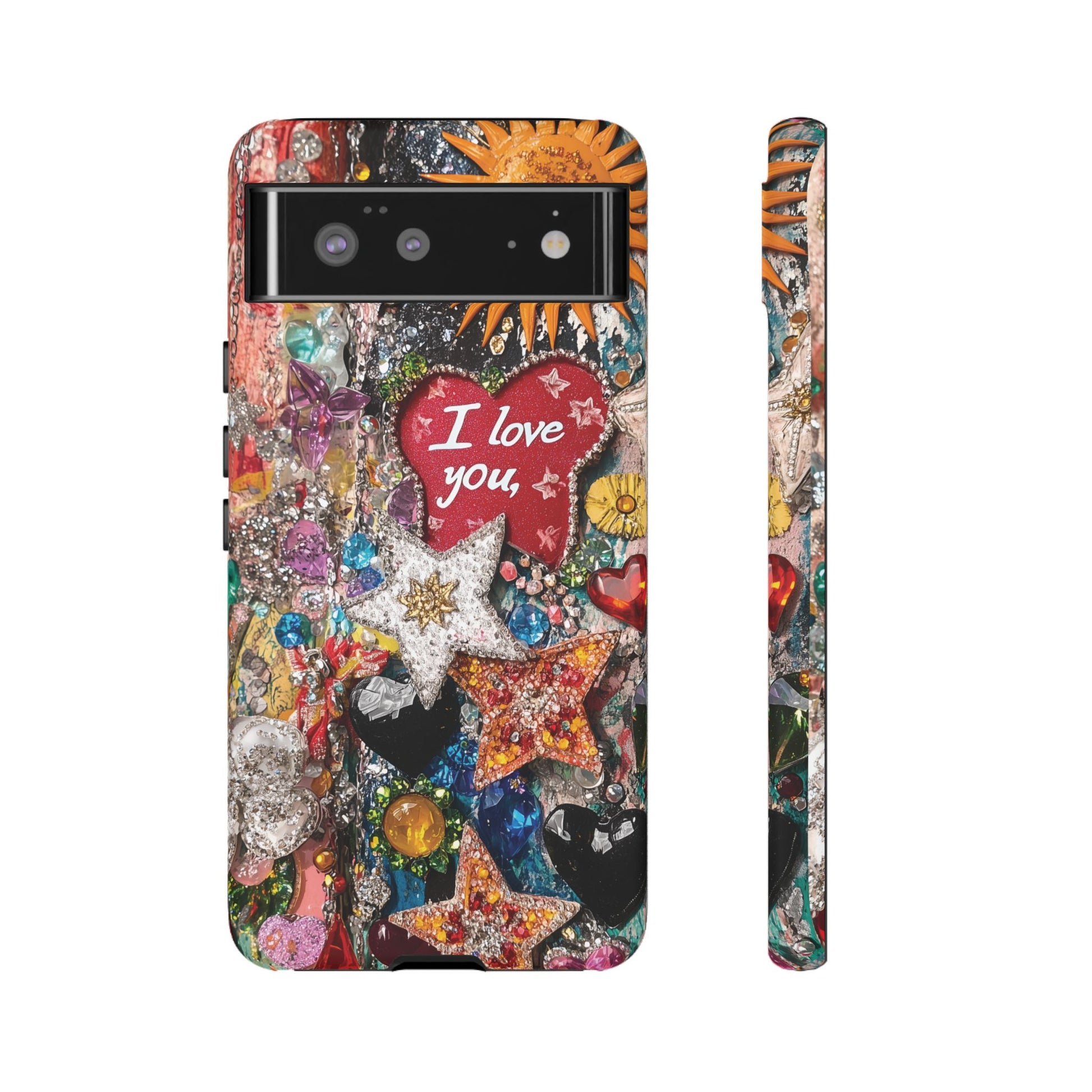 Express your love under a celestial sky with the "Starlight Mosaic" phone case. This unique design features a vibrant mosaic of textures, colors, and sparkling elements, centered around a heartfelt "I love you" message and adorned with twinkling stars. The "Starlight Mosaic" phone case is perfect for those who want to express their love in a unique and artistic way. It's a stylish and heartfelt way to add a personal touch to your everyday look and carry a piece of the starry sky with you.